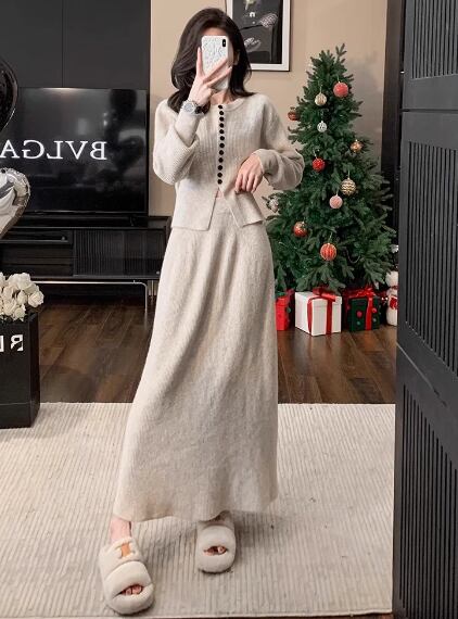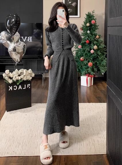 レディース トップス ニット セットアップ 2点セット ロングスカート ミモレ丈 ラウンドネック 襟なし タイト スリム 細身 Aライン フェミニン 大人可愛い きれいめ シンプル カジュアル 上品 おしゃれ こなれ感 ラフ 主役級 存在感 都会的 ベーシック ナチュラル 無地 秋 冬 ロングシーズン 20代 30代 お出かけ 休日 ショッピング カフェ 韓国 オルチャン コーデ 楽ちん 普段使い 着回し モテ 清楚 トレンド 流行 インスタ映え 定番 S M L ダークグレー アプリコット グリーン