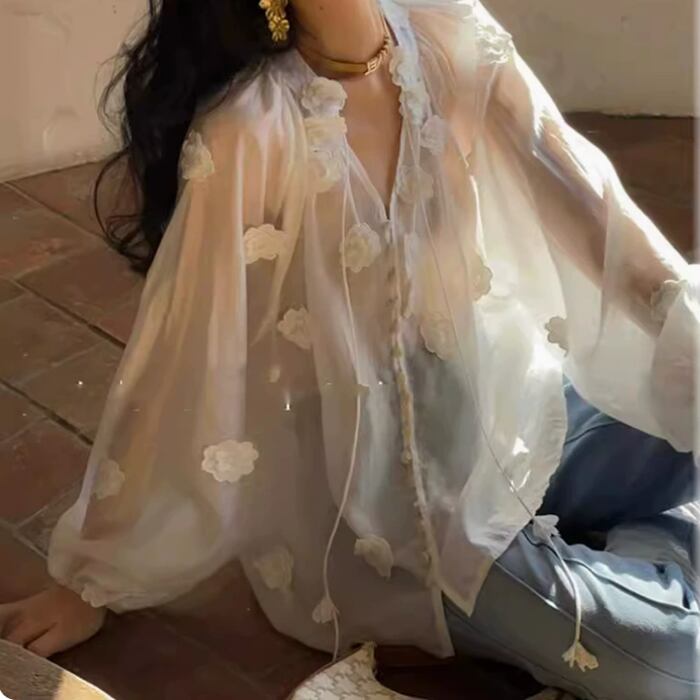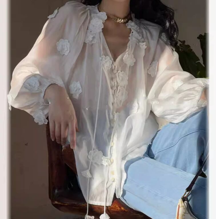 レディース トップス シャツ ブラウス 長袖 Vネック 襟なし ワイド フェミニン 透け感 シースルー 薄手 大人可愛い きれいめ シンプル カジュアル 上品 おしゃれ こなれ感 ラフ 個性的 主役級 存在感 都会的 ベーシック ナチュラル 花柄 フラワー 春 夏 ロングシーズン 10代 20代 30代 デート お出かけ 女子会 ショッピング カフェ 重ね着 普段使い 着回し モテ 清楚 トレンド 流行 インスタ映え 定番 S M L XL ゆったり 白 ホワイト ベーシックカラー 大人カラー