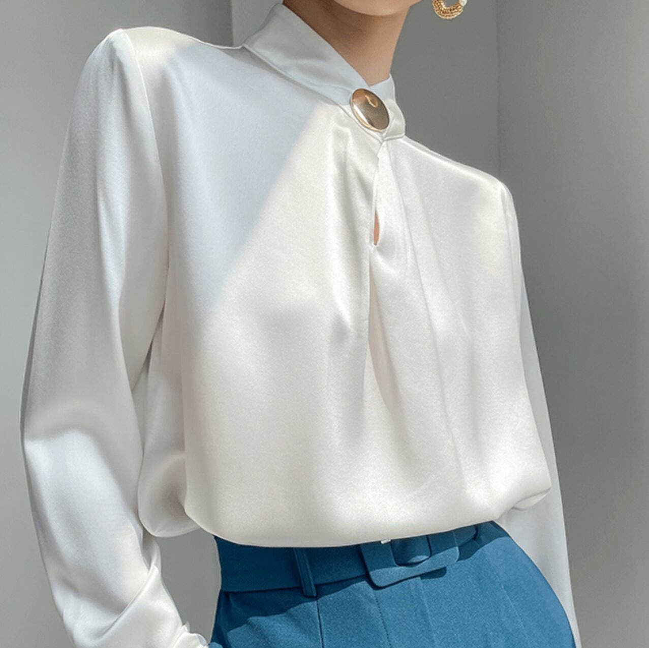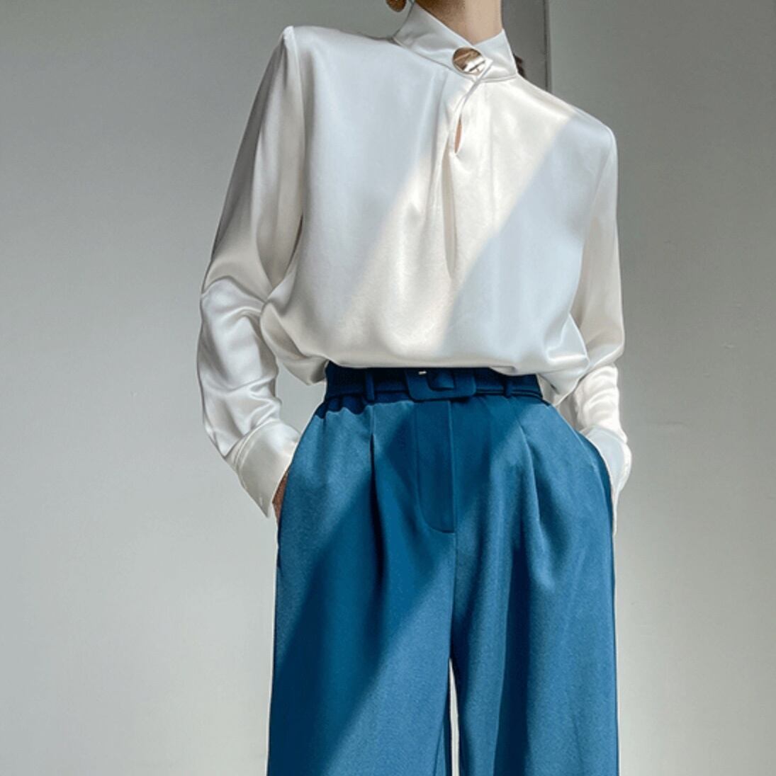 レディース トップス ブラウス カットソー 前開き 長袖 スタンドカラー フェミニン タック ボタン サテン かわいい 大人可愛い きれいめ シンプル 上品 おしゃれ かっこいい レトロ こなれ感 ガーリー クール モード系 エレガント モダン 主役級 存在感 抜け感 ヴィンテージ ラブリー キュート 都会的 ラグジュアリー クラシカル ロマンティック 無地 春 秋 デート パーティー イベント 普段使い 着回し トレンド インスタ映え S M L XL 白 ホワイト 黒 ブラック オフホワイト 光沢