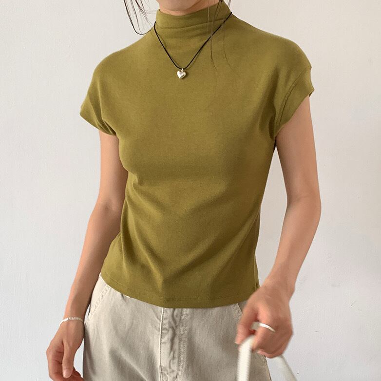 シックでスタイリッシュなスタンドカラー半袖ニットトップス。