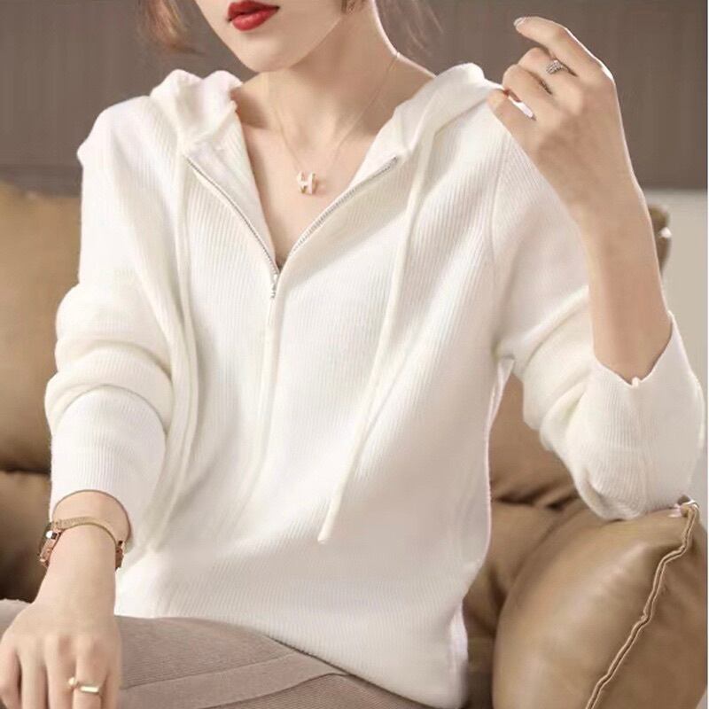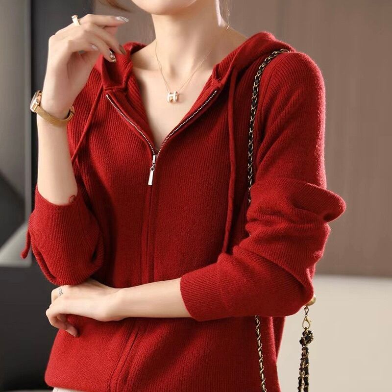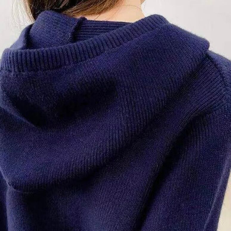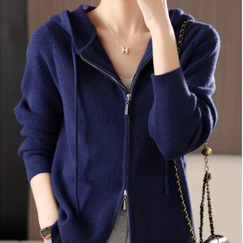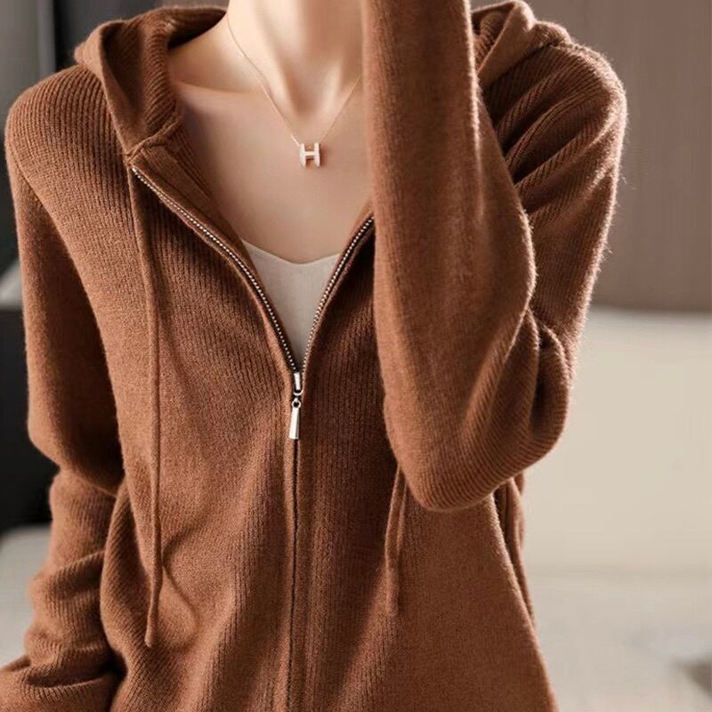 シンプルでおしゃれなフード付きニットパーカー、秋冬の必須アイテム。