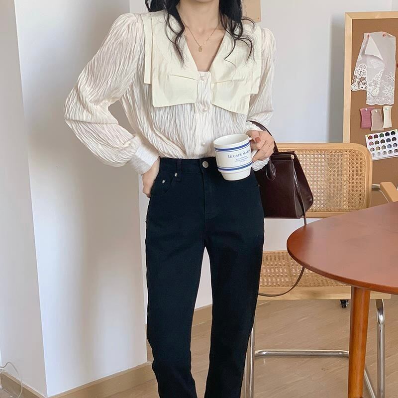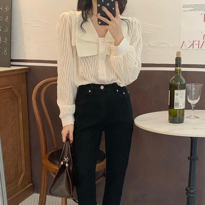 レディース トップス シャツ ブラウス 長袖 パフスリーブ Vネック フェミニン リボン 前開き ボタン かわいい 大人可愛い おしゃれ レトロ ガーリー エレガント 存在感 ヴィンテージ ラブリー キュート ロリータ ラグジュアリー クラシカル ロマンティック 無地 デート お出かけ パーティー イベント レストラン 休日 ショッピング コンサート ライブ 合コン コンパ カフェ 韓国 オルチャン 普段使い 着回し 清楚 トレンド 流行 インスタ映え フリーサイズ 黒 ブラック オフホワイト パール