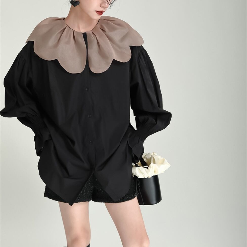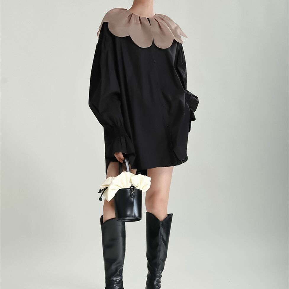 バイカラーの花びらのような襟がアクセントになったフレアビッグシャツ。ストレスフリーなシルエットでもきちんと感はそこなわない洗練された印象に。バランスよく新鮮に仕上がるフォルムでさらにスマートな見た目を加味
