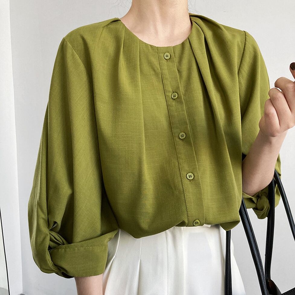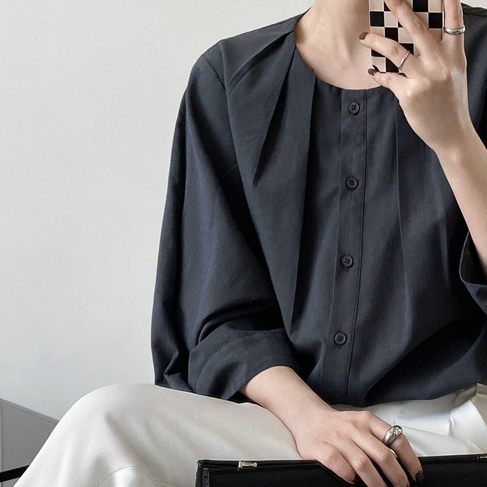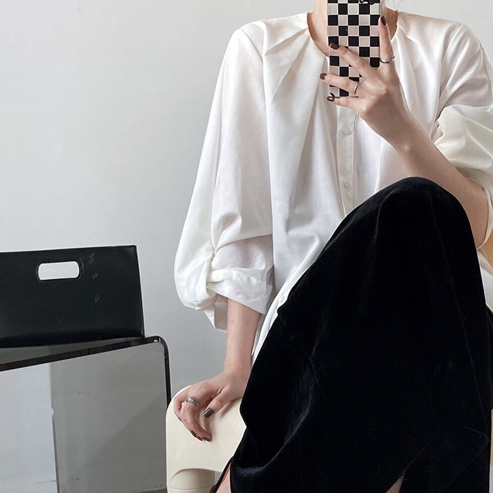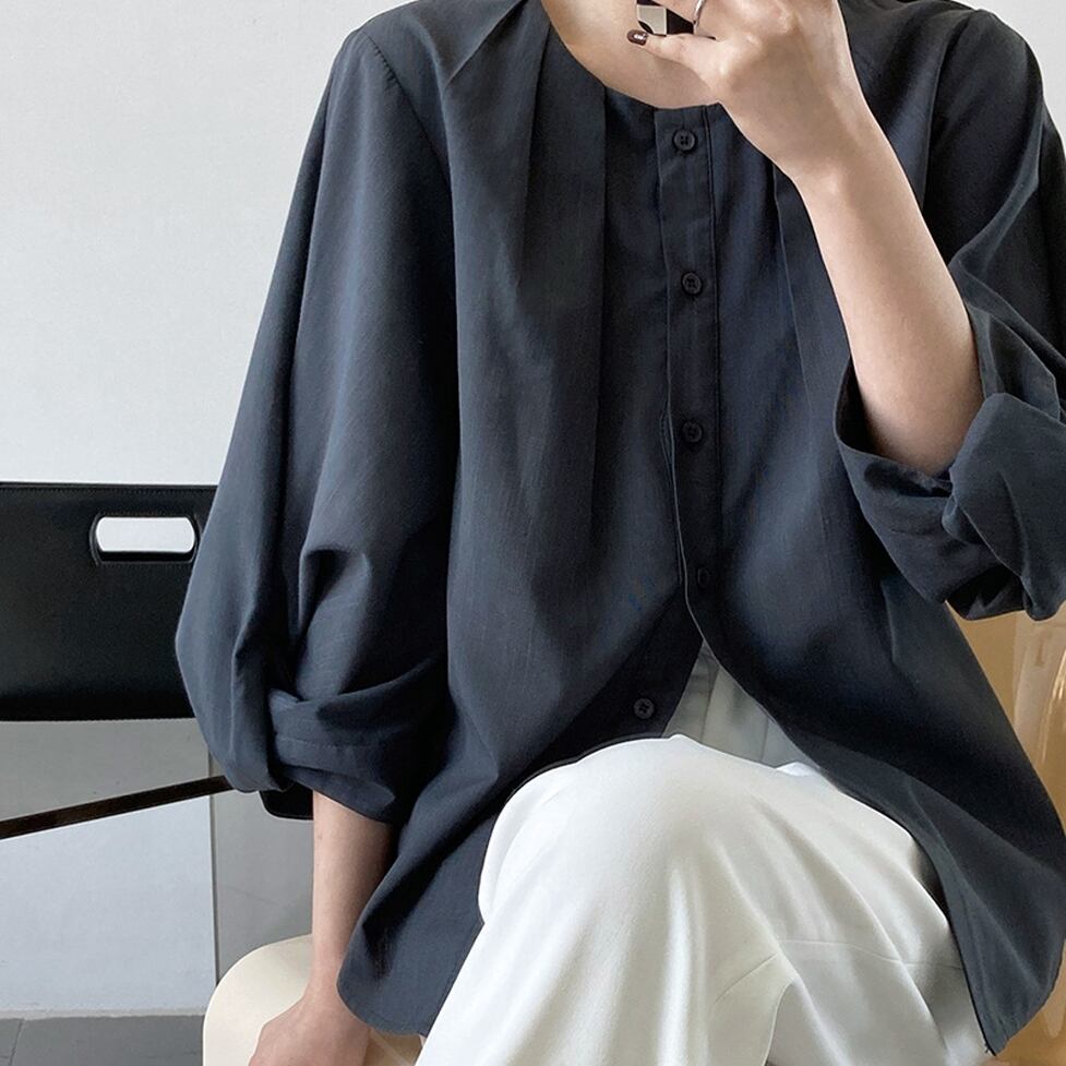 トップス シャツ ブラウス シャツブラウス バルーン袖シャツ バルーン袖ブラウス ノーカラーシャツ ノーカラーブラウス タックネックシャツ タックネックブラウス ノーカラー ラウンドネック 7分袖 シアーシャツ シアーブラウス 襟無し タック バルーンスリーブ レディース かわいい 大人可愛い おしゃれ こなれ感 ガーリー エレガント 主役級 存在感 キュート きれいめ 上品 シンプル カジュアル 抜け感 通勤 通学 デート お出かけ イベント 女子会 休日 ショッピング 体型カバー ゆったり フェミニン