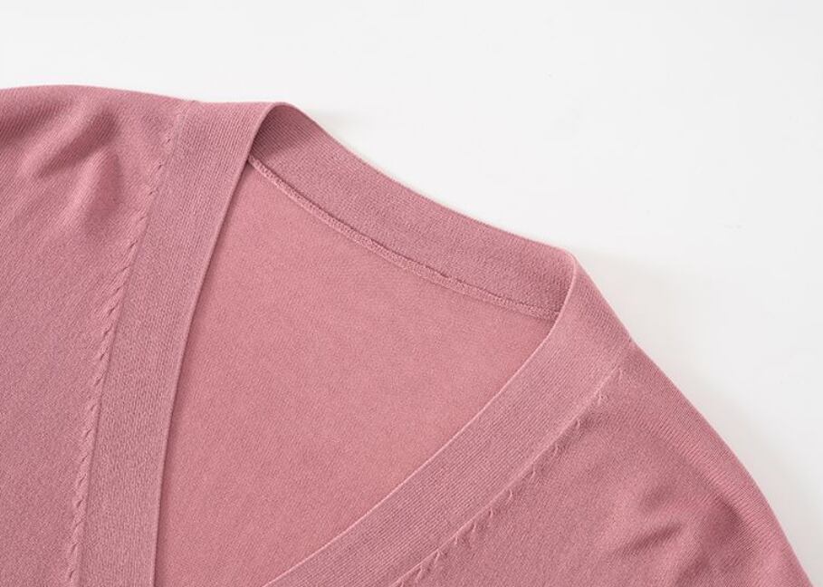 Vネックデザインでスタイリッシュな印象を与えつつ、襟なしのシンプルなシルエットが魅力。