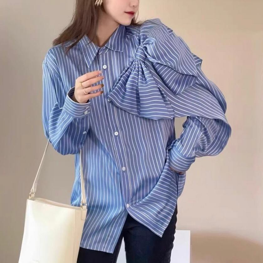 レディース トップス シャツ ブラウス 前開き アシンメトリー 長袖 フェミニン リボン ドッキング かわいい 大人可愛い おしゃれ かっこいい ガーリー 個性的 クール モード系 エレガント モダン 主役級 存在感 ラブリー キュート 都会的 ラグジュアリー ロマンティック ストライプ 春 秋 クリスマス バレンタイン デート お出かけ パーティー イベント レストラン 休日 重ね着 韓国 オルチャン 着回し レイヤード トレンド 流行 インスタ映え S M L 小さいサイズ 大きいサイズ 水色 ブルー