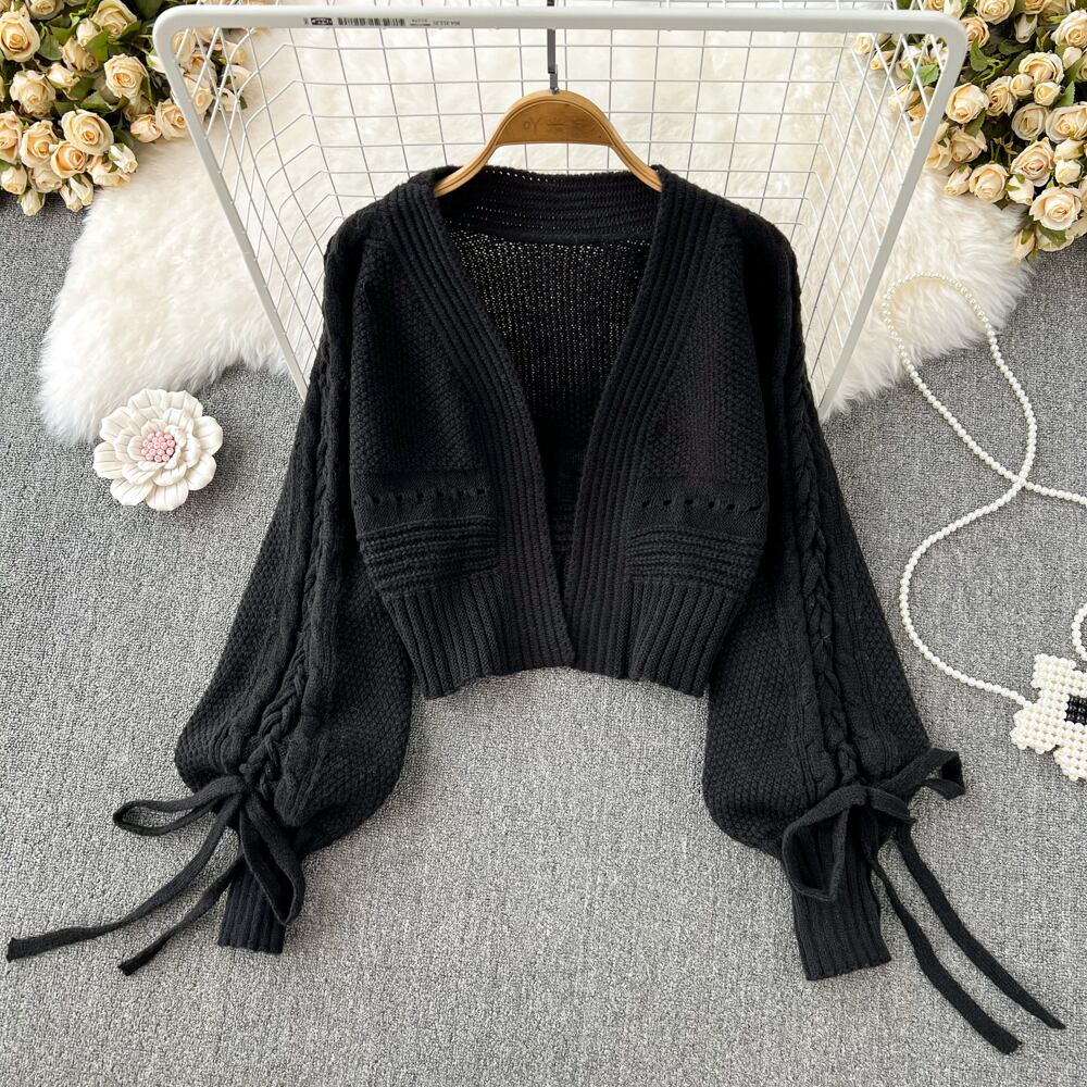 レディース トップス ニット カーディガン 羽織 前開き ショート 長袖 ボリューム袖 バルーン袖 フェミニン リボン ハイウエスト 編み込み 編み上げ 透け感 シースルー かわいい 大人可愛い 上品 おしゃれ レトロ ガーリー 存在感 ラブリー キュート クラシカル ロマンティック 無地 デート お出かけ イベント 旅行 レストラン 休日 ライブ 重ね着 韓国 オルチャン 普段使い 着回し レイヤード トレンド 流行 インスタ映え フリーサイズ 白 ホワイト 黒 ブラック ベージュ レッド 緑 グリーン