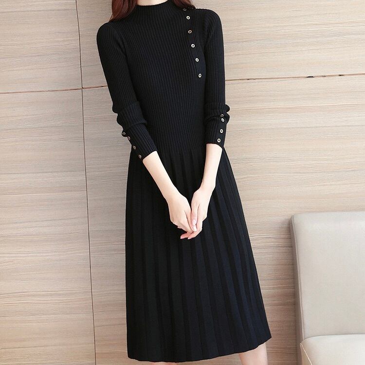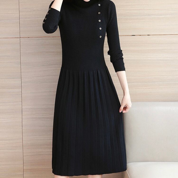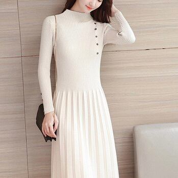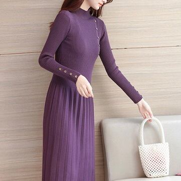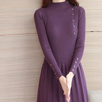 レディース ワンピース 膝丈 膝下 長袖 ボトルネック フレア Aライン フェミニン プリーツ ウエストマーク ボタン ニット リブニット かわいい 大人可愛い きれいめ シンプル カジュアル 上品 おしゃれ かっこいい レトロ こなれ感 ガーリー ラグジュアリー アクティブ ロマンティック ナチュラル 無地 デート お出かけ イベント レストラン 韓国 オルチャン 普段使い 着回し 清楚 S M L XL 2XL 小さいサイズ 大きいサイズ 黒 ブラック 紫 オフホワイト 大人カラー 秋カラー パープル