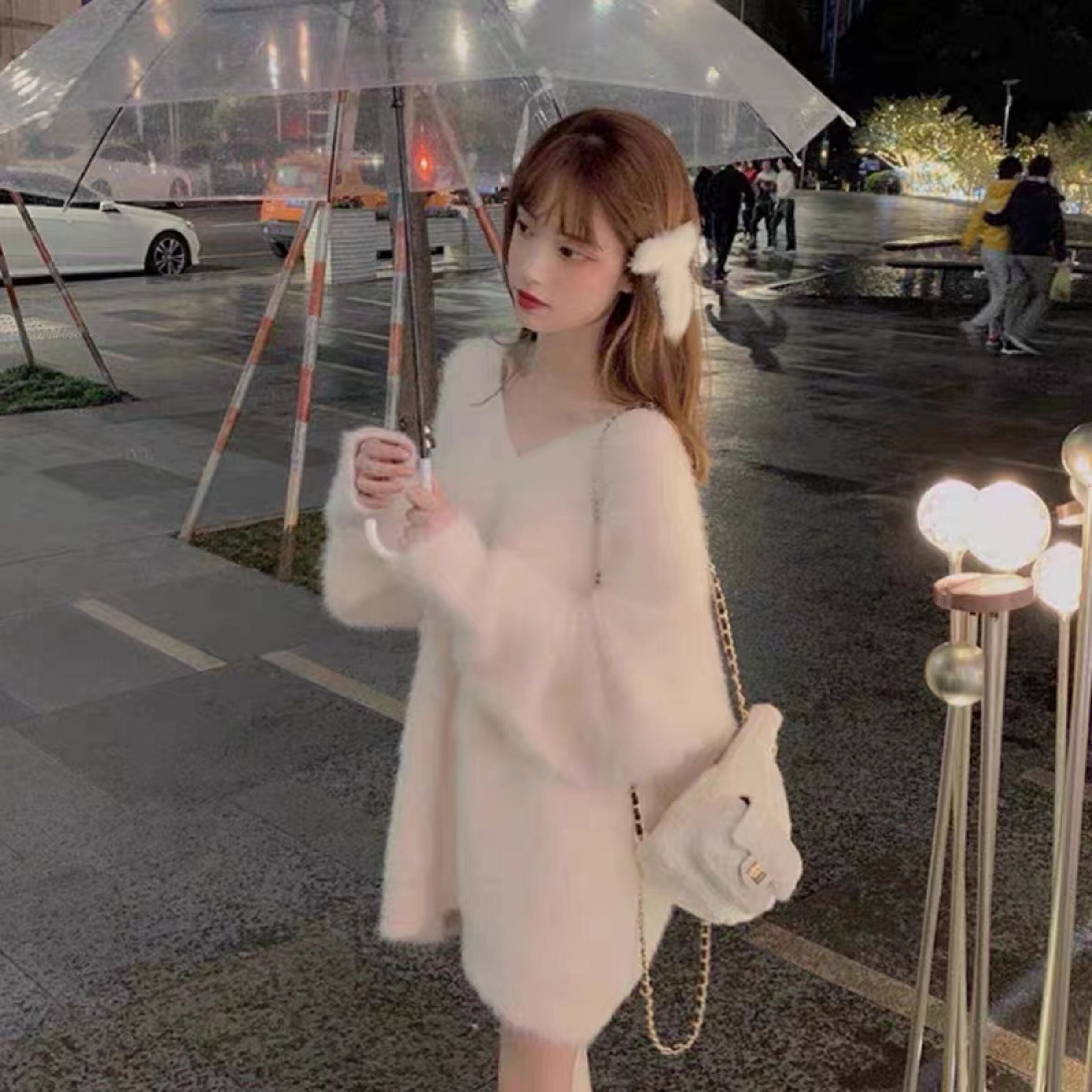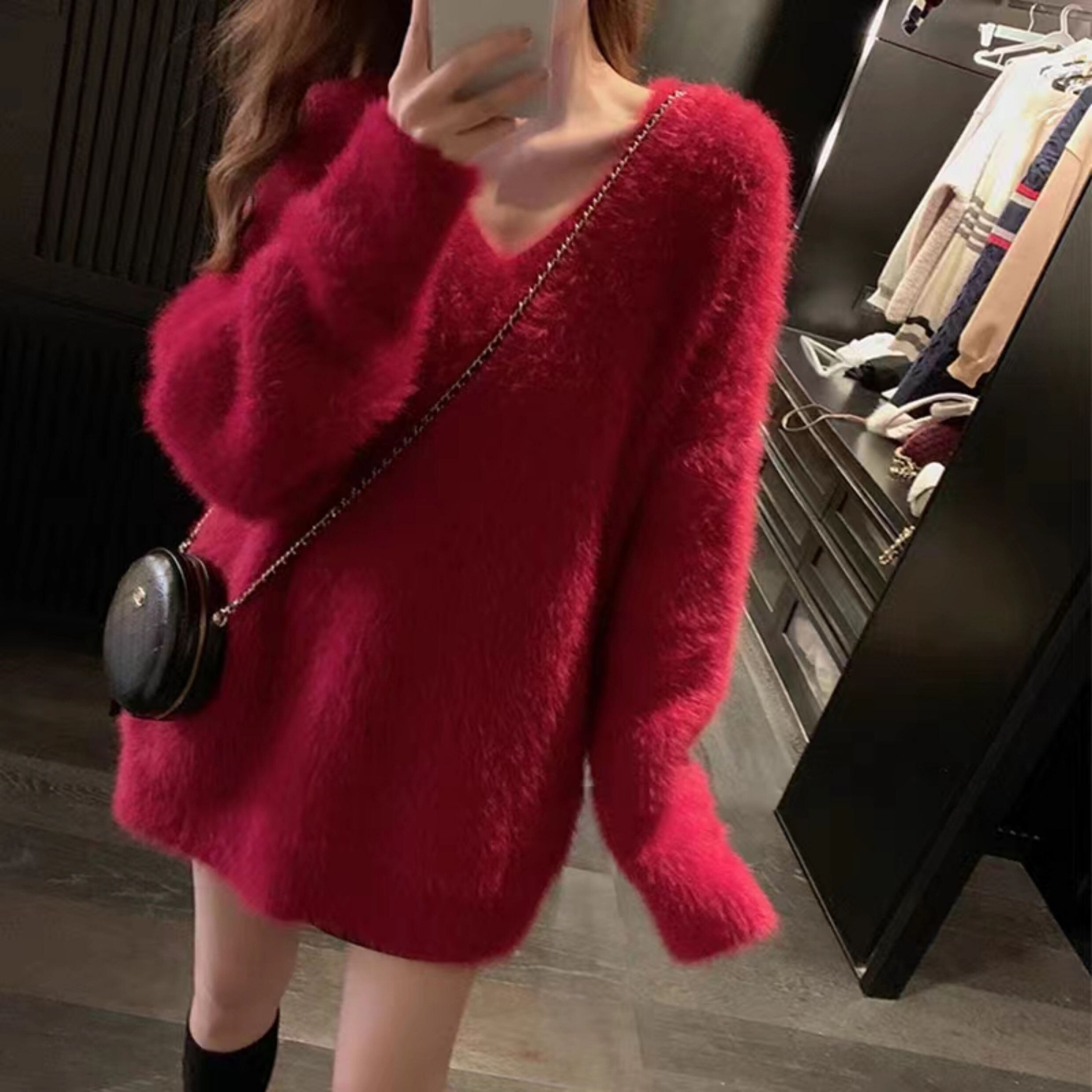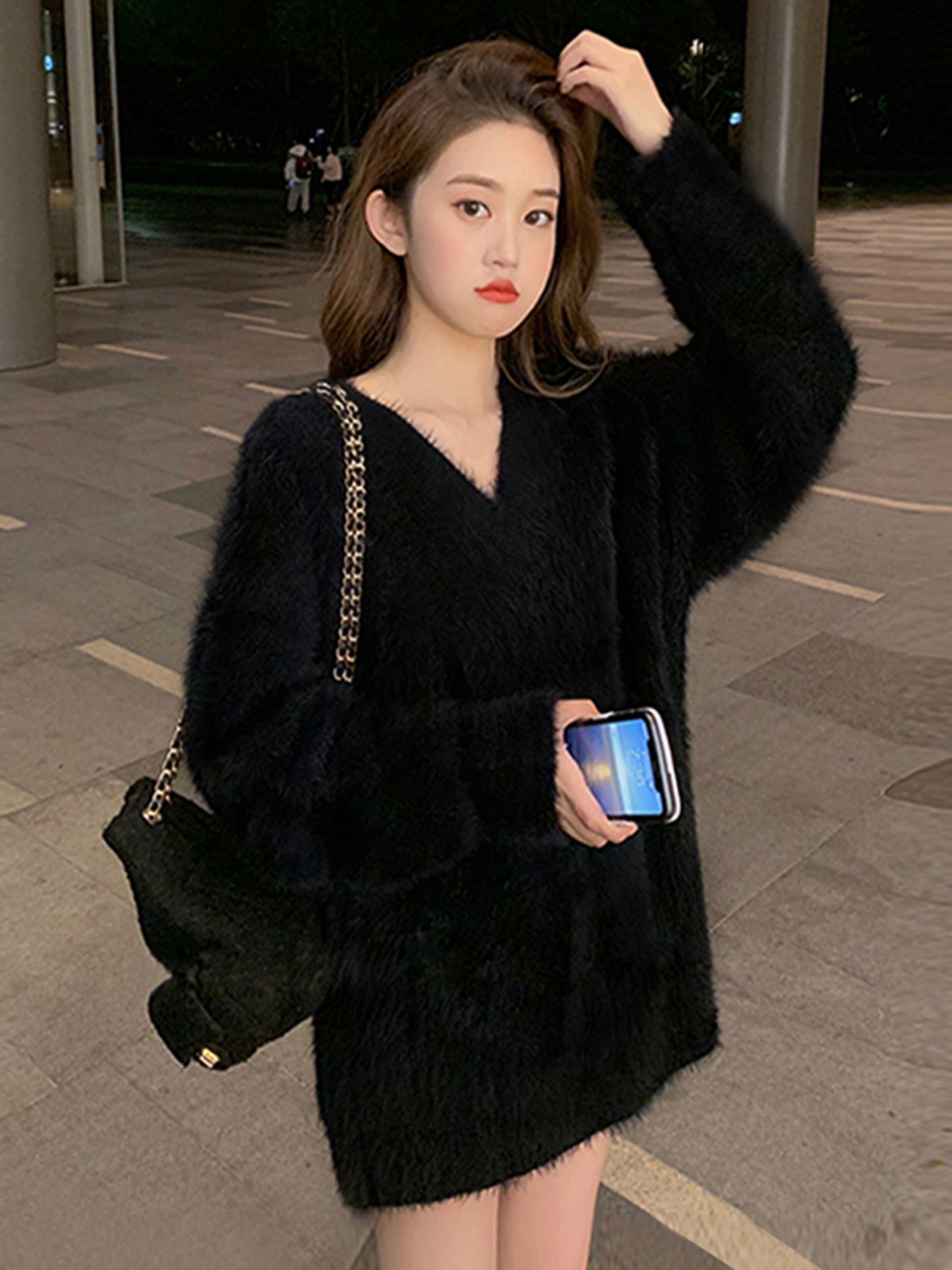 このセーターは、長袖のVネックデザインとふわふわの素材感が特徴です。