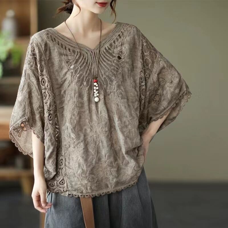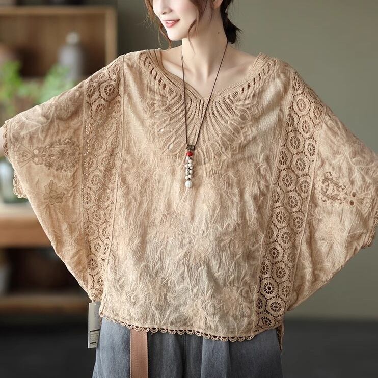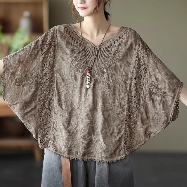 トップス ブラウス 5分袖 ドルマンスリーブ Vネック プルオーバー 透かし編み 刺繡 ミディアム丈 透け感 かわいい 大人可愛い きれいめ シンプル 上品 おしゃれ かっこいい カジュアル こなれ感 個性的 主役級 存在感 抜け感 春 夏 ベーシック ナチュラル キュート クール 女性用 レディース ママ マタニティ OL 通勤 オフィス 学生 通学 デート お出かけ お泊まり 女子会 旅行 休日 アウトドア カフェ ショッピング イベント 普段使い デイリー 着回し 重ね着 ワンサイズ トレンド