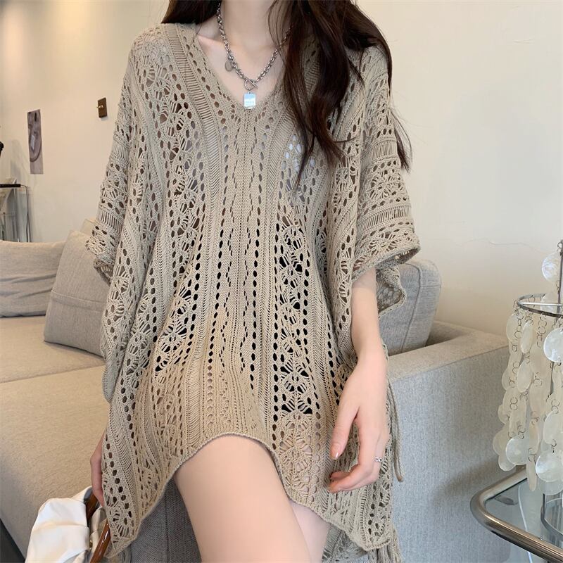 こちらのサマーセーターは、5分袖のVネックデザインで、透かし編みが施された上品な一着です。