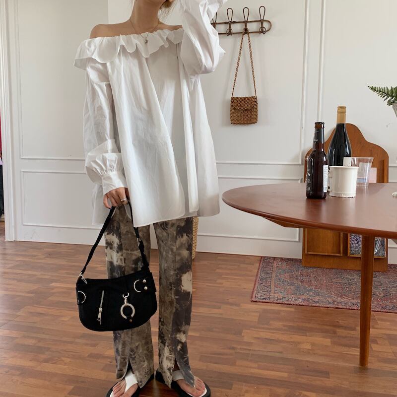 レディース トップス シャツ ブラウス ロング 長袖 ボリューム袖 オフショルダー ワンショルダー オーバーサイズ フェミニン ストリート フリル スリット サイドスリット かわいい 大人可愛い きれいめ シンプル カジュアル おしゃれ かっこいい レトロ こなれ感 ラフ ガーリー ルーズ ラブリー キュート ラグジュアリー クラシカル アクティブ ロマンティック ナチュラル ワイルド 無地 セクシー 春 秋 トレンド 流行 インスタ映え ゆったり ゆる フリーサイズ 白 ホワイト 黒 ブラック カーキ