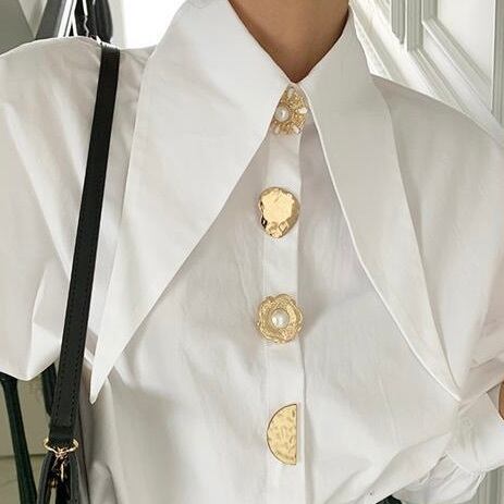 シャープな襟元とランダムに輝くゴールドボタンが洗練された個性を演出。