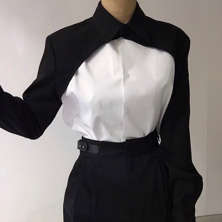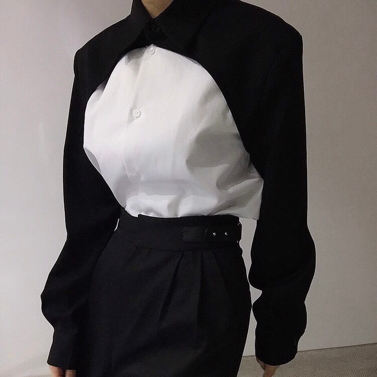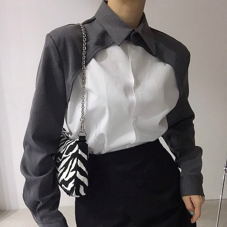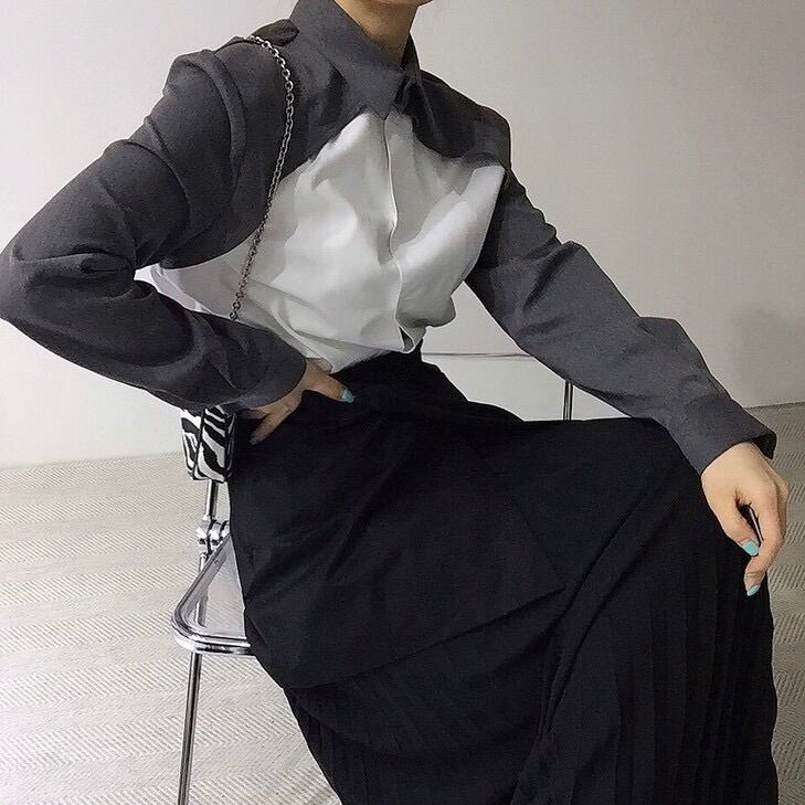 レディース トップス シャツ ブラウス 前開き アシンメトリー 長袖 襟付き 角襟 切り替え ドッキング フェミニン ストリート バイカラー 配色 かわいい 大人可愛い おしゃれ かっこいい こなれ感 ガーリー 個性的 クール モード系 エレガント モダン 主役級 存在感 抜け感 ラブリー キュート 都会的 ラグジュアリー クラシカル ワイルド 無地 春 秋 デート 休日 コンサート ライブ モノトーン 韓国 オルチャン 着回し レイヤード トレンド 流行 インスタ映え フリーサイズ 黒 ブラック グレー