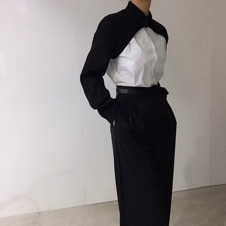 アシンメトリーなデザインとバイカラーの配色が個性を引き立てるモードな一着。