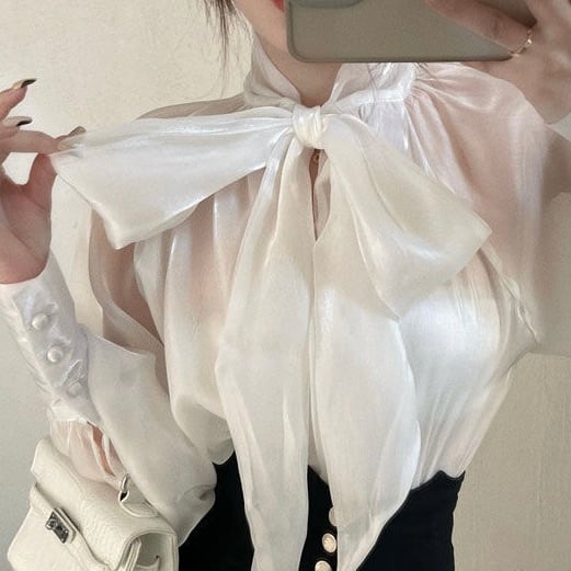 レディース トップス シャツ ブラウス 長袖 ボリューム袖 カフスリーブ バルーン袖 りぼんタイ ネクタイ ネクタイ付き フェミニン かわいい 大人可愛い きれいめ 上品 おしゃれ かっこいい レトロ こなれ感 ガーリー エレガント モダン 主役級 存在感 フォーマル かっちり ヴィンテージ ラブリー キュート 都会的 ラグジュアリー クラシカル ロマンティック 無地 春 秋 入学式 入園式 卒業式 卒園式 謝恩会 結婚式 パーティー イベント S M L オフホワイト 紫 光沢 メタリック パープル