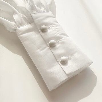 ボリューム袖と光沢感のある生地がフォーマルシーンにも映える華やかさ。