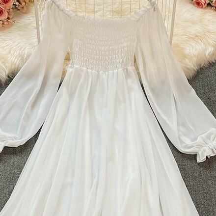 ロング丈の長袖ワンピースは、スクエアネックがデコルテを美しく見せ、シースルーのボリューム袖が可愛らしさをプラスします。