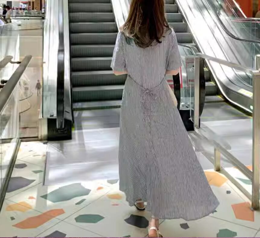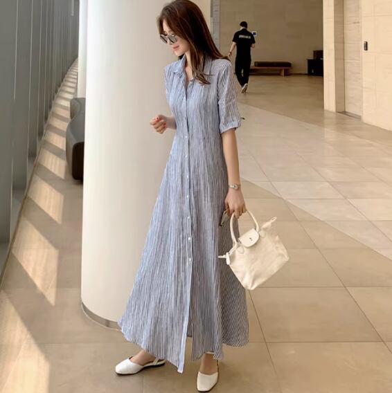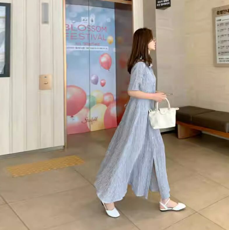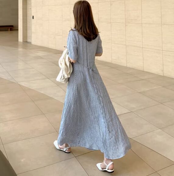 レディース ワンピース 前開き ロング 半袖 襟付き ワイド Aライン フェミニン 薄手 大人可愛い きれいめ シンプル カジュアル 上品 おしゃれ こなれ感 ラフ ルーズ クール エレガント 主役級 存在感 都会的 ベーシック ナチュラル ストライプ 春 夏 ロングシーズン 20代 30代 40代 デート お出かけ 女子会 休日 ショッピング カフェ コーデ 楽ちん 体型カバー 普段使い 着回し モテ トレンド 流行 インスタ映え 定番 S M L XL ゆったり ベーシックカラー 大人カラー