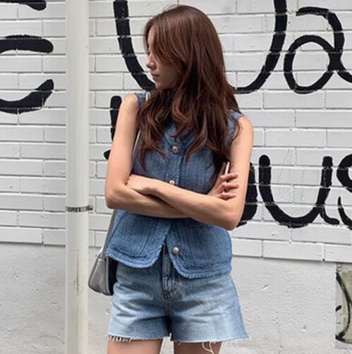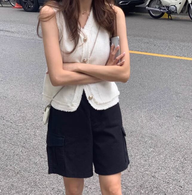 前開きとノースリーブデザインで軽やかな印象を与え、Vネックとタイトなシルエットは、女性らしさを引き立てます。
