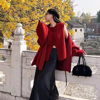 ニットベストは、ラウンドネックと前開きボタンデザインを特徴とし、ミディアム丈でアシンメトリーなシルエットが魅力的です。
