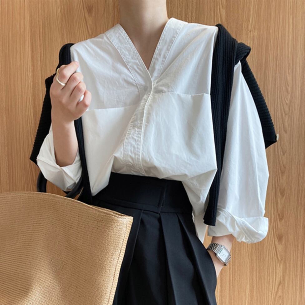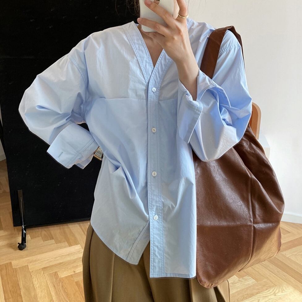 シンプルなシルエットですっきりした印象のVネックノーカラーシャツ。しなやかなムードが女性らしさを生む味わい深くやさしいイメージチェンジに。気負って見えずそっと背中を押してくれる品のいい服