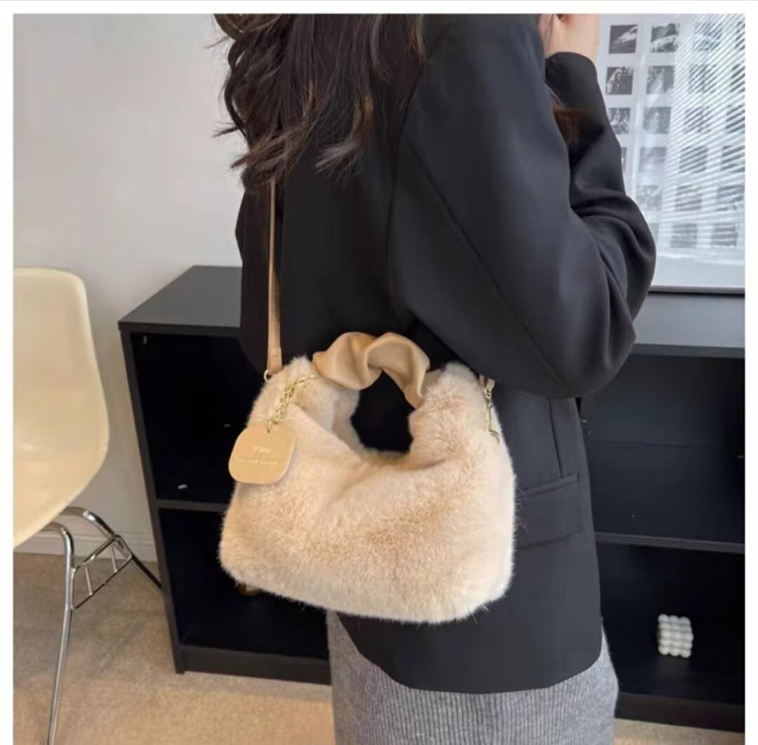 ふんわりファー×丸型フォルムで大人可愛く華やぐハンドバッグ。