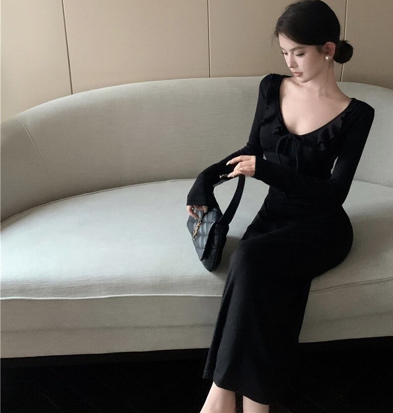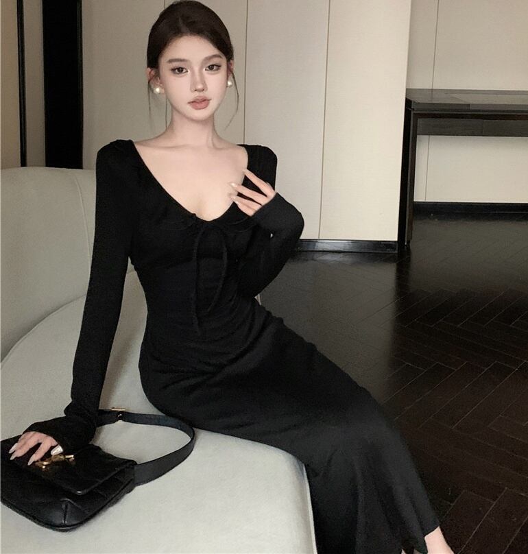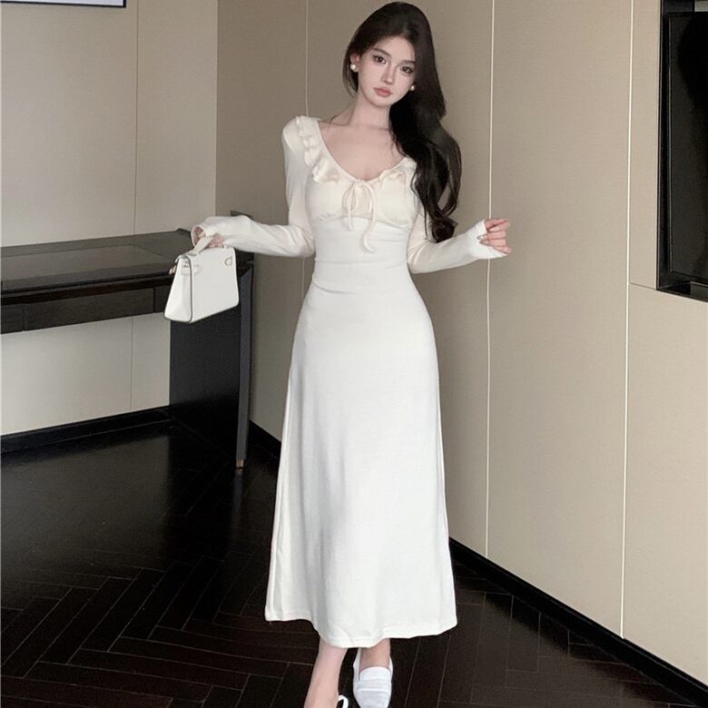ワンピース ロングワンピース 長袖 胸元 深Vネック ウエストマーク タイト セミフレア フリル かわいい 大人可愛い きれいめ シンプル 上品 おしゃれ かっこいい カジュアル こなれ感 個性的 主役級 存在感 抜け感 春 秋 ベーシック ナチュラル キュート エレガント フェミニン 無地 女性用 レディース OL 通勤 学生 通学 デート お出かけ お泊まり 女子会 旅行 休日 カフェ ショッピング コンパ ディナー 二次会 普段使い デイリー 着回し 重ね着 S M L XL トレンド モテ