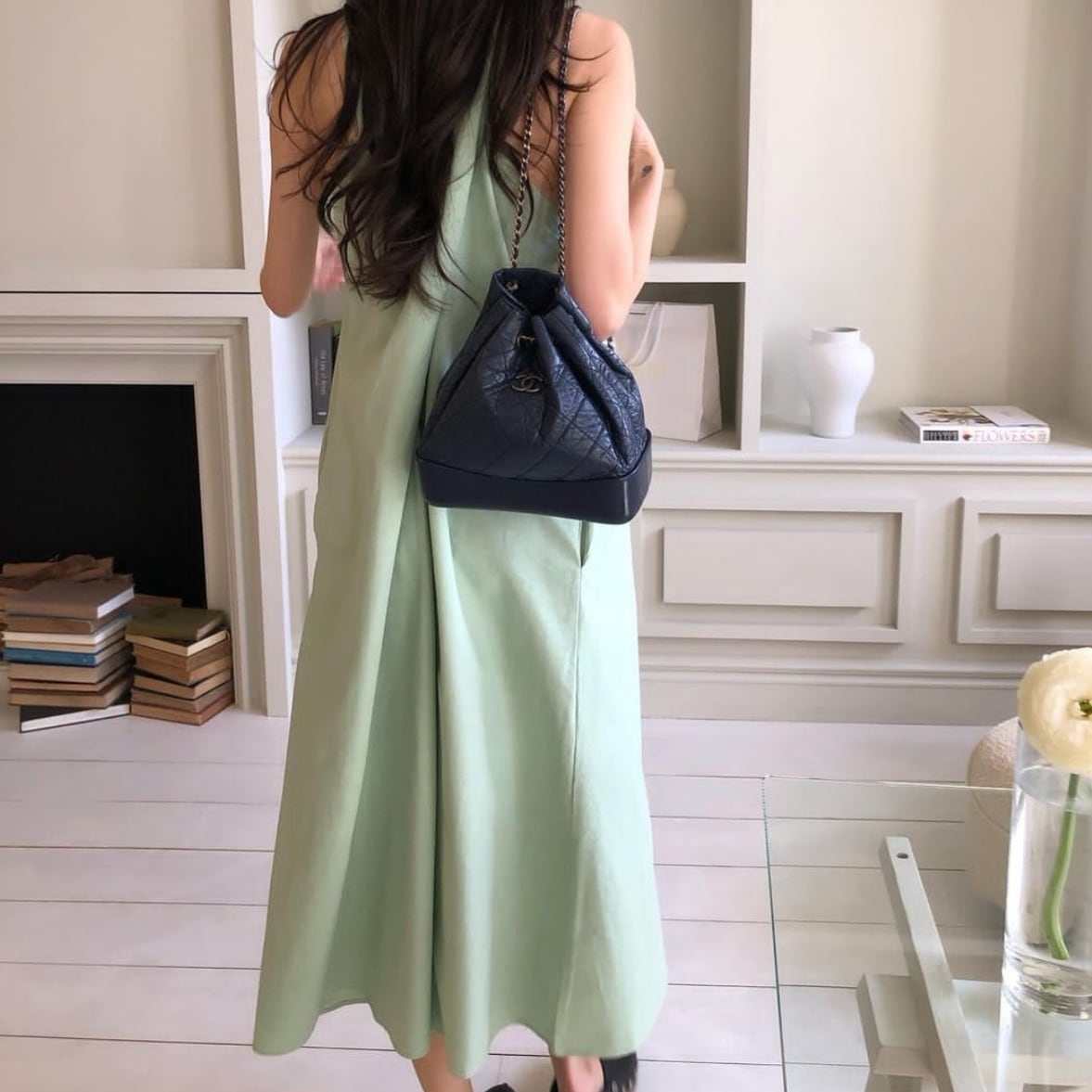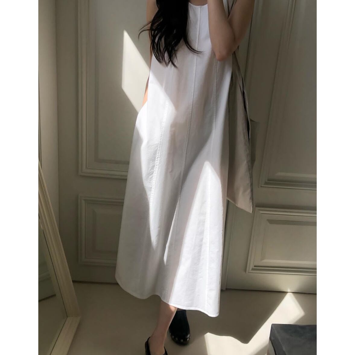 シンプルなデザインにバッククロスのシルエットが大人の抜け感を引き出すノースリーブワンピース。キレよく着られるディテールがカジュアル系と相性のいい秘訣。品をそえる適度な甘さと華やかさを兼ねそなえた合わせやすいデザイン