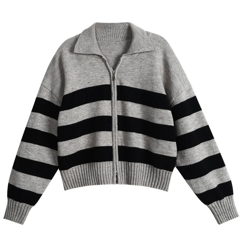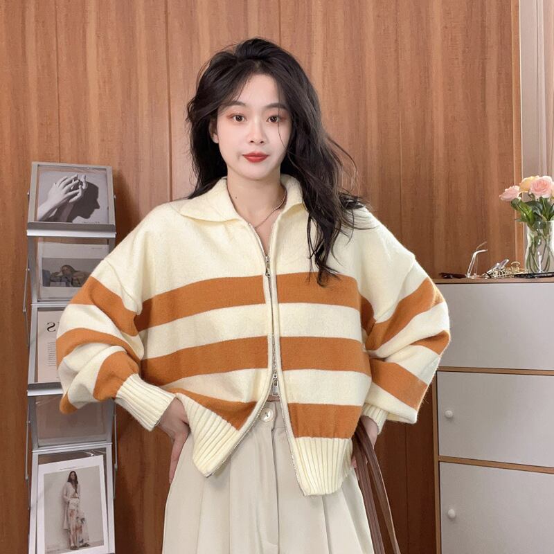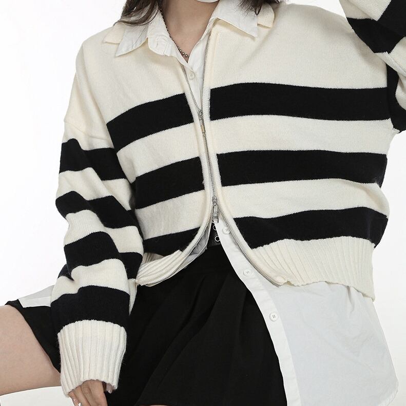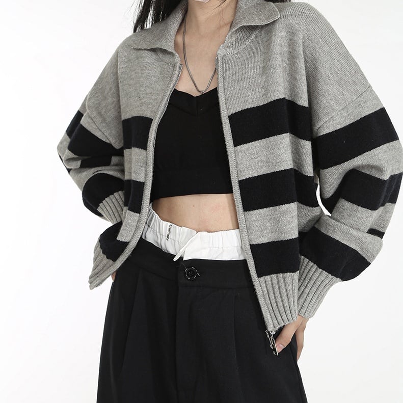 トップス カーディガン ニットカーディガン 長袖 襟付き 前開き ダブルジップ ミディアム丈 わいい 大人可愛い きれいめ シンプル 上品 おしゃれ かっこいい カジュアル こなれ感 個性的 主役級 存在感 抜け感 秋 冬 ベーシック ナチュラル クール メンズライク ボーダー柄 女性用 レディース ママ マタニティ OL 通勤 オフィス 学生 通学 デート お出かけ お泊まり 女子会 旅行 アウトドア 休日 カフェ ショッピング イベント 普段使い デイリー 着回し 重ね着 ワンサイズ トレンド モテ