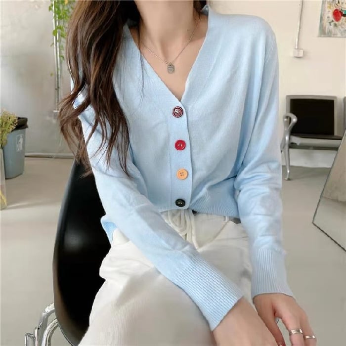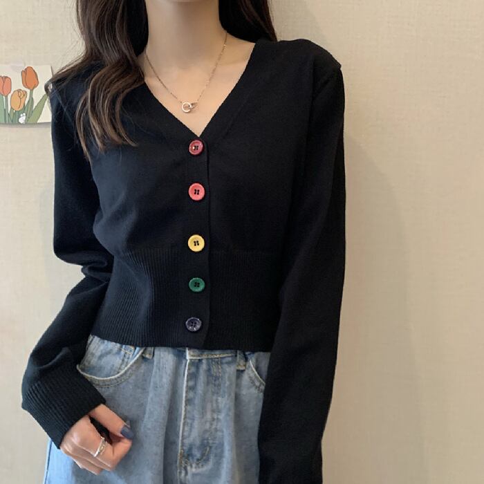 トップス カーディガン 長袖 Vネック 前開き デザイン ボタン ショート丈 かわいい 大人可愛い きれいめ シンプル 上品 おしゃれ かっこいい カジュアル こなれ感 個性的 主役級 存在感 抜け感 春 秋 ベーシック ナチュラル フェミニン 無地 女性用 レディース ママ OL 通勤 オフィス 学生 通学 デート お出かけ お泊まり 女子会 旅行 休日 アウトドア カフェ ショッピング イベント コンパ レイヤード 普段使い デイリー 着回し 重ね着 ワンサイズ トレンド モテ カラーバリエーション