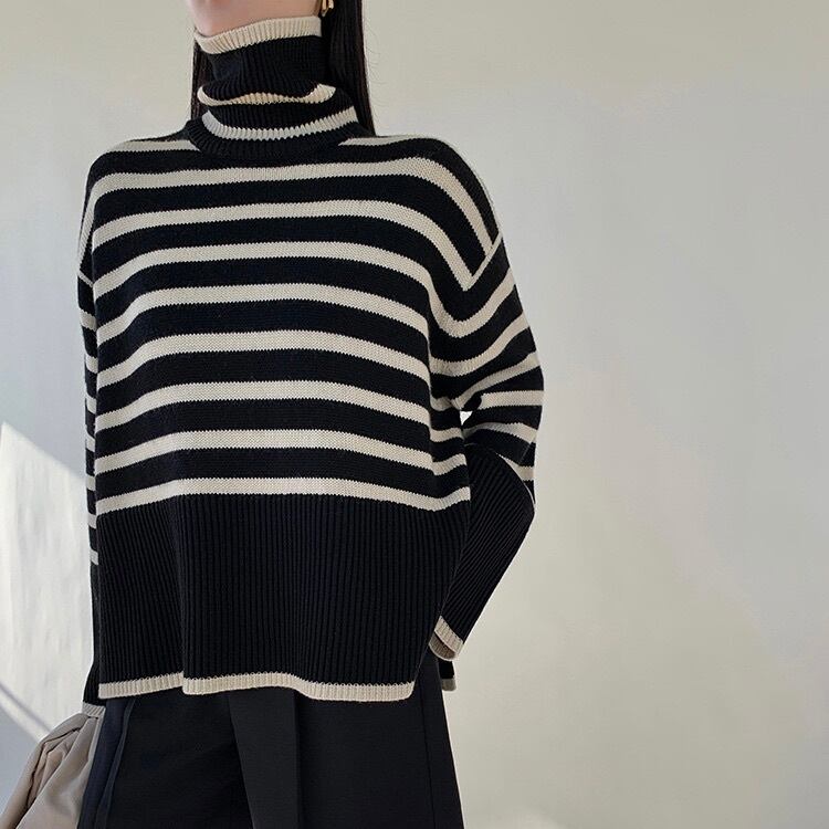 レディース トップス ニット セーター プルオーバー 長袖 ハイネック スリット サイドスリット かわいい 大人可愛い きれいめ シンプル カジュアル 上品 おしゃれ かっこいい レトロ こなれ感 ラフ 抜け感 ヴィンテージ ラブリー キュート ナチュラル ボーダー 秋 冬 デート お出かけ イベント 旅行 女子会 休日 ショッピング 重ね着 お揃い 双子 韓国 オルチャン 普段使い 着回し レイヤード 定番 ビッグ ゆったり ゆる フリーサイズ 白 ホワイト 黒 ブラック モノトーン ベーシックカラー