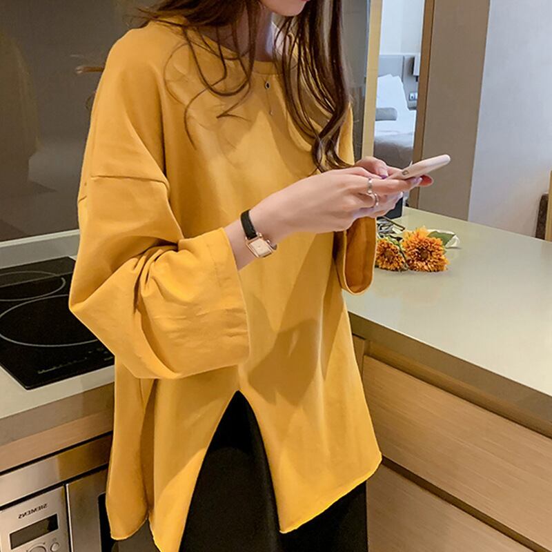 トップス Tシャツ 長袖 ラウンドネック プルオーバー ミディアム丈 サイドスリット かわいい 大人可愛い きれいめ シンプル 上品 おしゃれ かっこいい カジュアル こなれ感 個性的 主役級 存在感 抜け感 春 夏 ベーシック ナチュラル キュート クール メンズライク 無地 女性用 レディース ママ マタニティ OL 通勤 学生 通学 デート お出かけ お泊まり 女子会 旅行 休日 アウトドア カフェ ショッピング レイヤード 普段使い デイリー 着回し 重ね着 M L XL 2XL オーバーサイズ