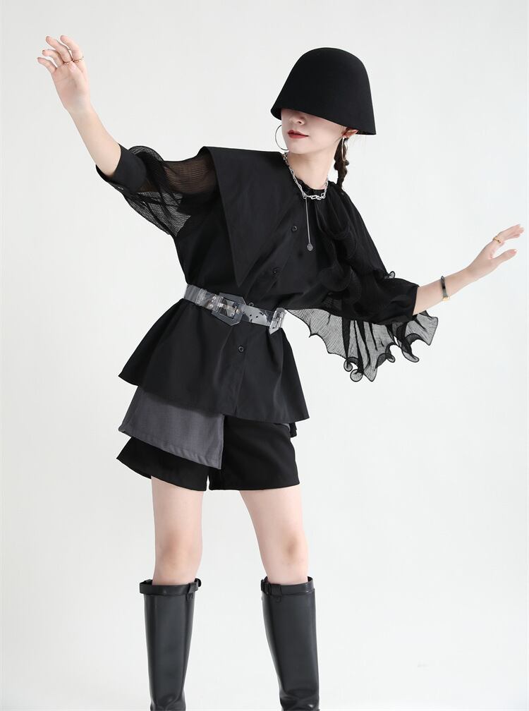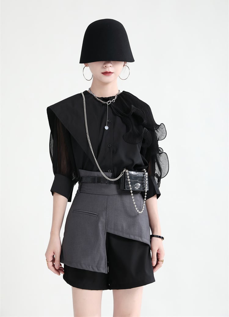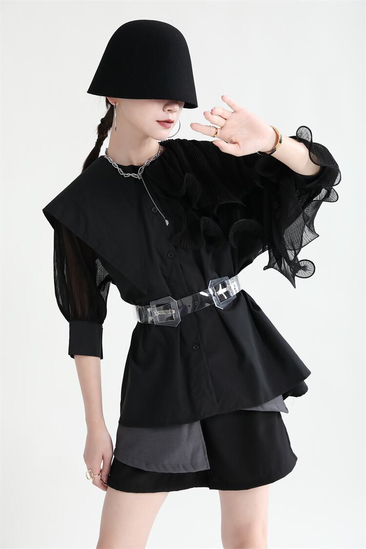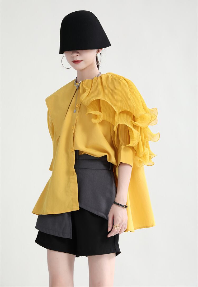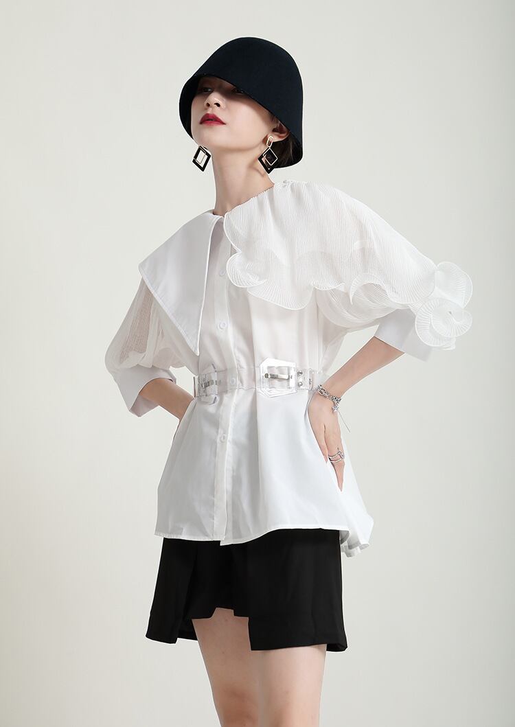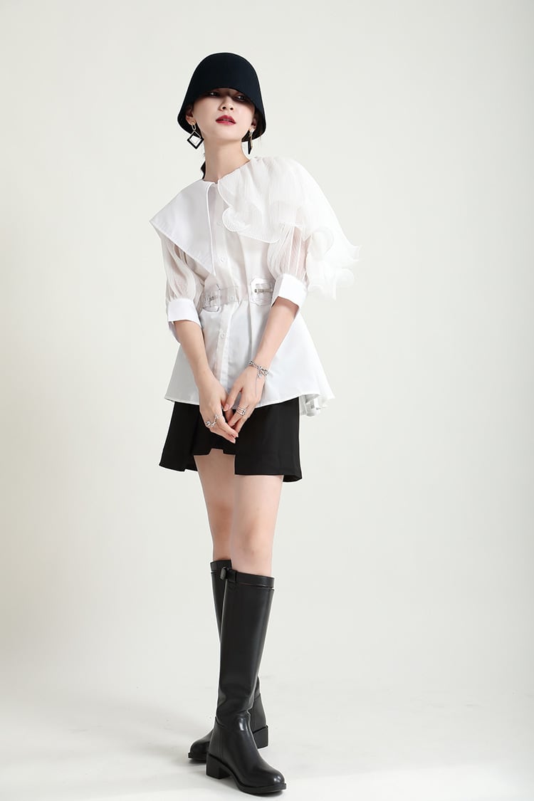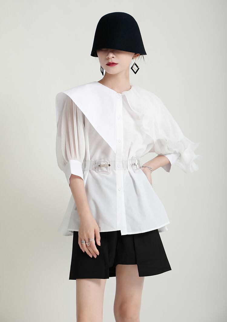 ビッグカラーと異素材ミックスが魅力のこの長袖シャツは、大人可愛いスタイルを演出します。