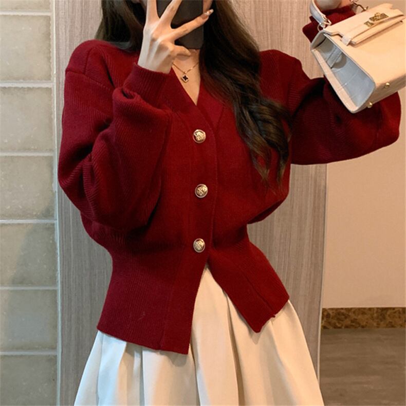 上品さとかわいらしさを兼ね備えたカーディガンは、長袖のVネックデザインで、前開きボタンがアクセントとなっています。