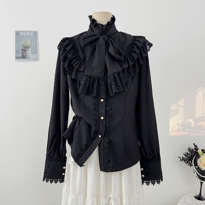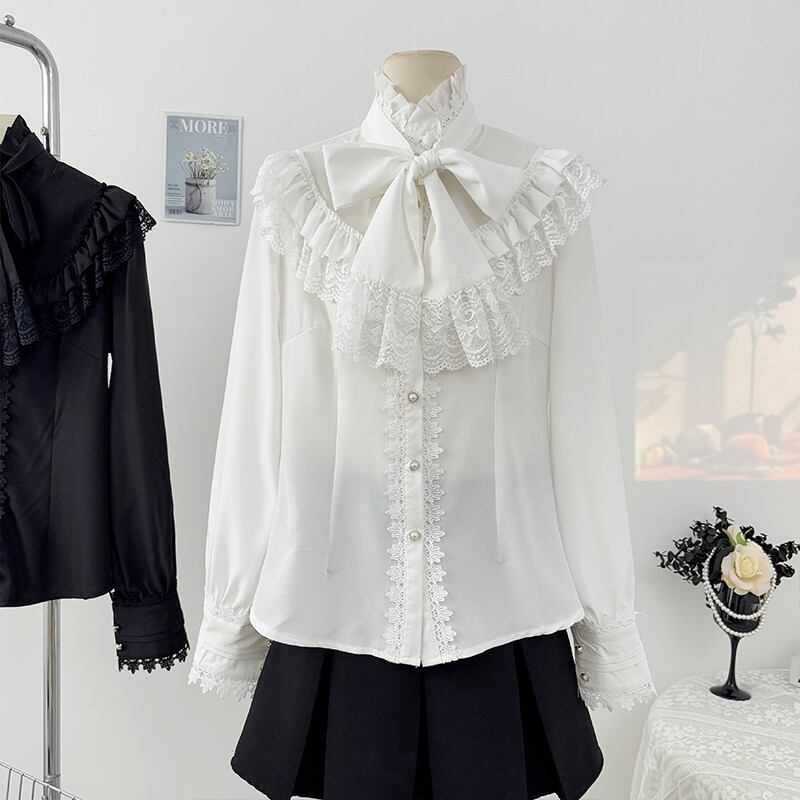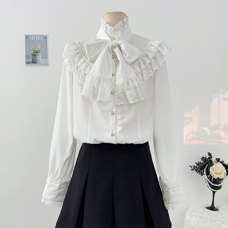 レディース トップス シャツ ブラウス 長袖 りぼんタイ フェミニン ルーズフィット レース フリル リボン ボタン ビジューボタン パールボタン かわいい 大人可愛い きれいめ 上品 おしゃれ レトロ ガーリー 主役級 存在感 ラグジュアリー クラシカル 無地 春 デート お出かけ イベント レストラン 女子会 休日 ホテル ショッピング カフェ モノトーン 韓国 オルチャン コーデ 普段使い 着回し モテ 清楚 インスタ映え フリーサイズ ワンサイズ Fサイズ 白 ホワイト 黒 ブラック