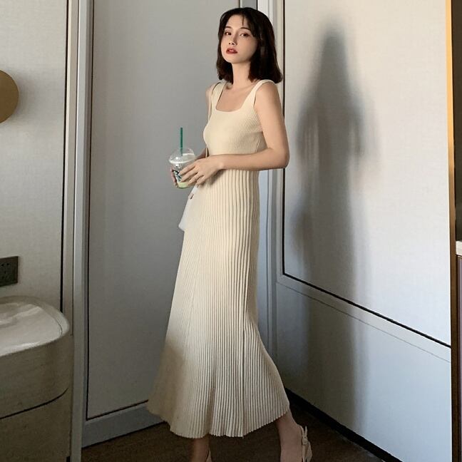 ノースリーブのデザインとスクエアネックが特徴のこのワンピースは、春夏コーデにぴったり。