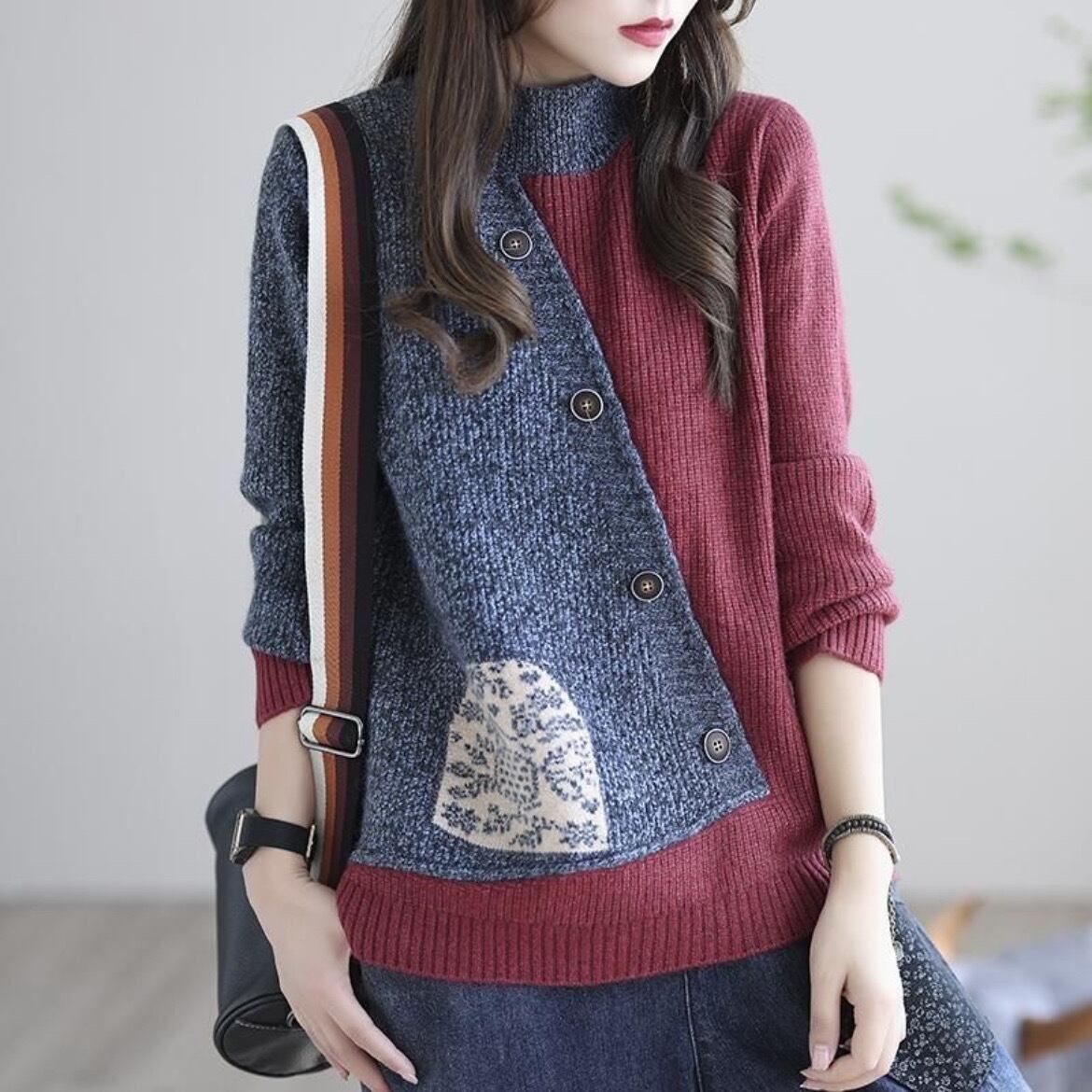 レディース トップス ニット セーター レギュラー丈 長袖 ハイネック スタンドカラー ストレート アシンメトリー 切り替え スリット サイドスリット リブ リブニット ボタン 切り替えデザイン 配色 ステッチ カジュアル おしゃれ かっこいい レトロ 個性的 存在感 無地 柄 秋 冬 ママ 10代 20代 30代 40代 学生 お出かけ 旅行 公園 休日 ショッピング 韓国 コーデ 暖かい 普段使い インスタ映え S M L XL 2XL 白 ホワイト グレー ブルー レッド 緑 グリーン カラバリ