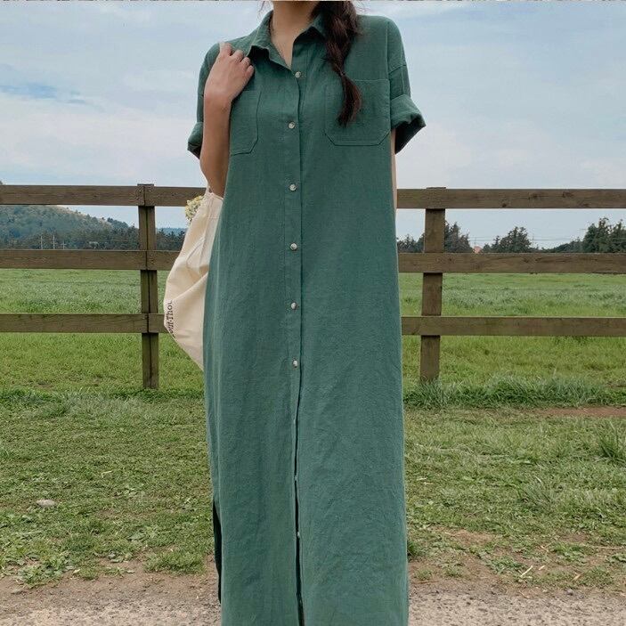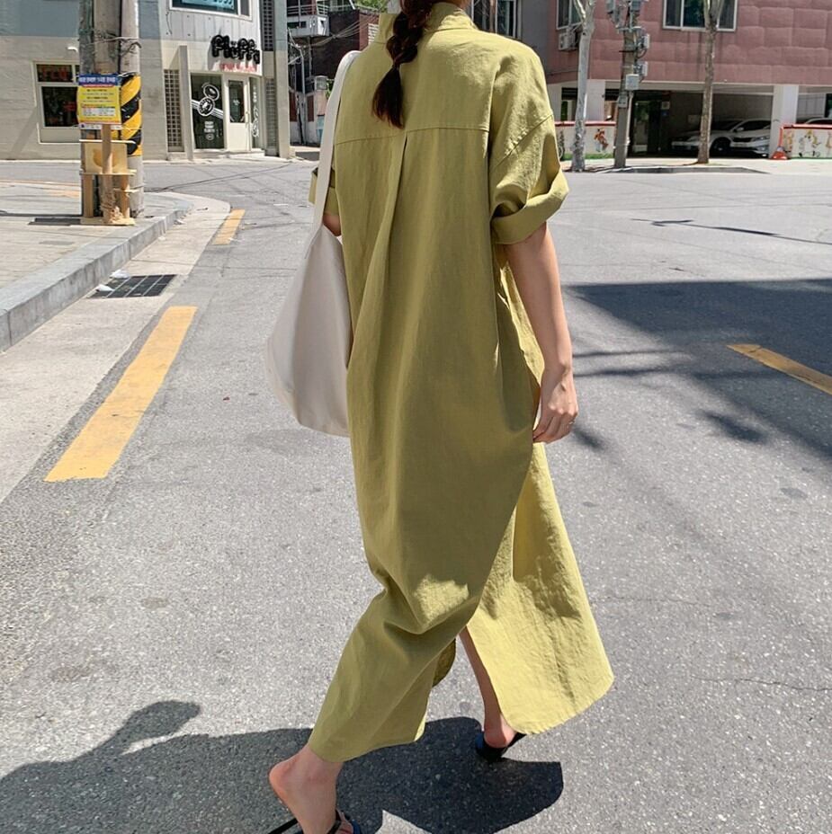 レディース ワンピース シャツワンピ 前開き ロング マキシ 半袖 襟付き 角襟 ストレート Iライン フェミニン ストリート ポケット かわいい 大人可愛い きれいめ シンプル カジュアル 上品 おしゃれ レトロ こなれ感 ラフ ガーリー ルーズ ヴィンテージ ラブリー キュート アクティブ 無地 夏 デート お出かけ リゾート 旅行 アースカラー 重ね着 体型カバー 普段使い 着回し レイヤード トレンド 流行 M L ゆったり ゆる グレー 黄色 イエロー ベージュ 緑 グリーン ベーシックカラー