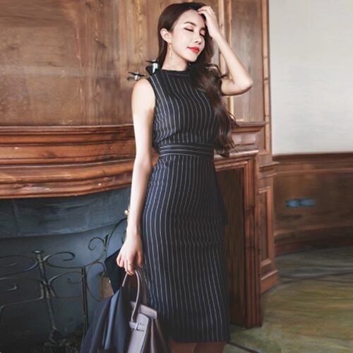 レディース ワンピース 膝丈 袖なし ノースリーブ クルーネック 襟なし タイト スリム 細身 ウエストマーク バックスリット きれいめ シンプル 上品 おしゃれ かっこいい こなれ感 個性的 クール 主役級 存在感 都会的 ベーシック ナチュラル ストライプ 春 夏 ロングシーズン デート お出かけ パーティー イベント レストラン ホテル カフェ コーデ 楽ちん 美脚 脚長 モテ 清楚 トレンド 流行 インスタ映え 定番 スタイルアップ S M L XL ネイビー ベーシックカラー 大人カラー