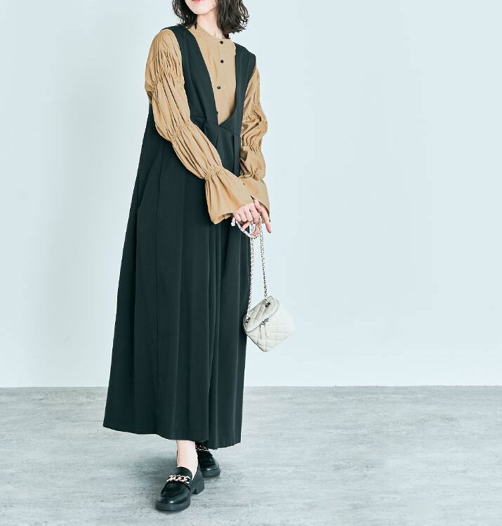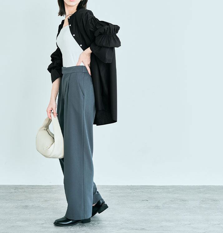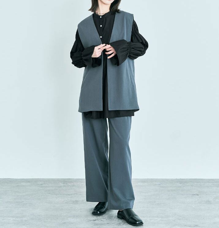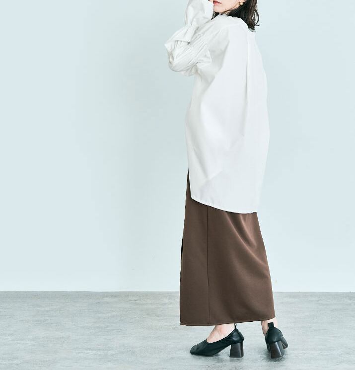 前開きのデザインとサイドスリットがスタイリッシュさを演出し、モード系からカジュアルまで幅広いコーディネートに対応します。