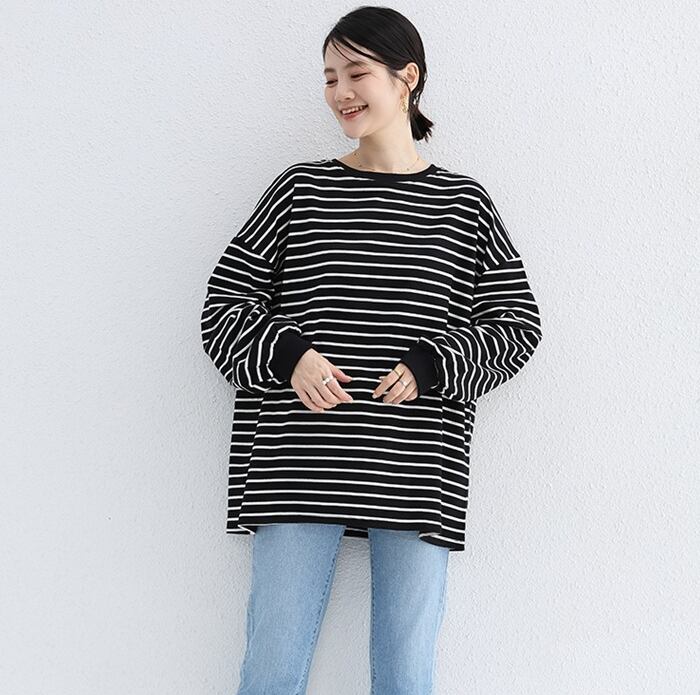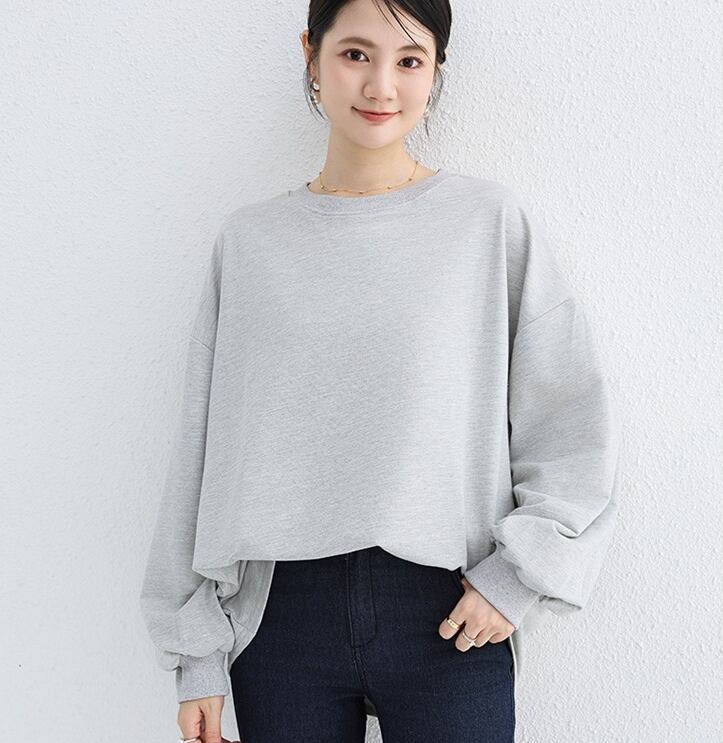 ワイドなシルエットとクルーネックが、ラフなのに上品なこなれスタイルを実現。