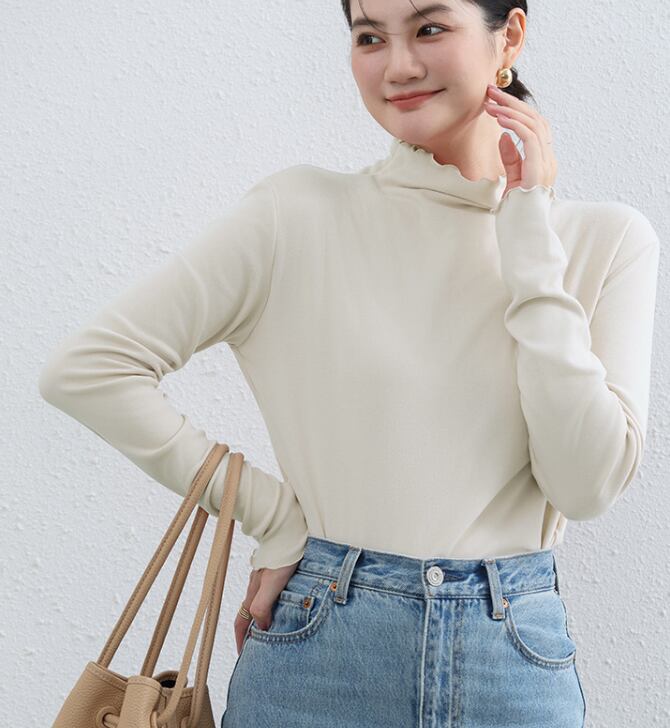 ハイネック×スリムデザインが首元からスッキリ見せ、上品かつ都会的な印象に。