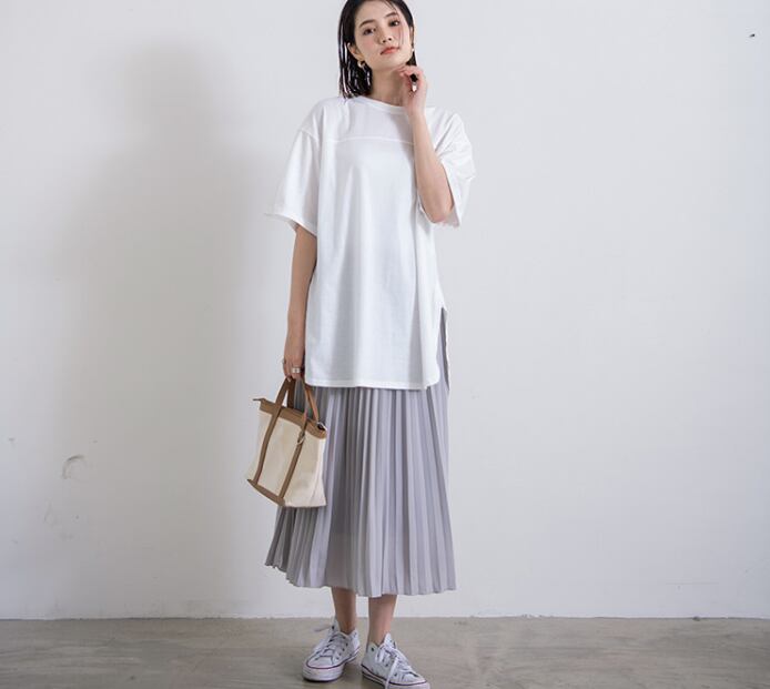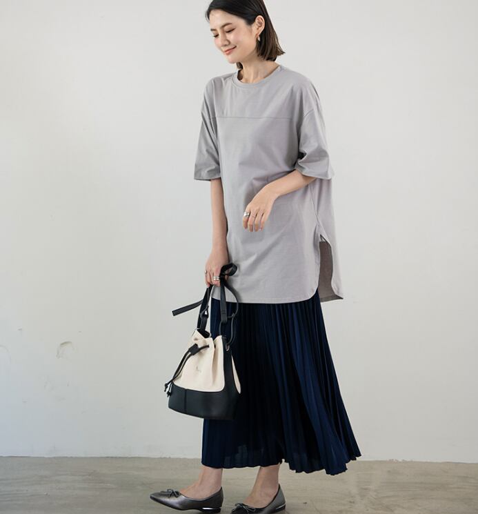 シンプルなクルーネック&無地デザインは、春夏のデイリーコーデに大活躍。