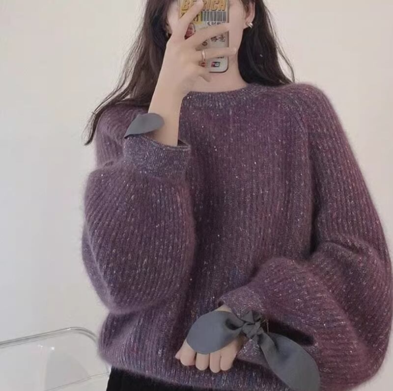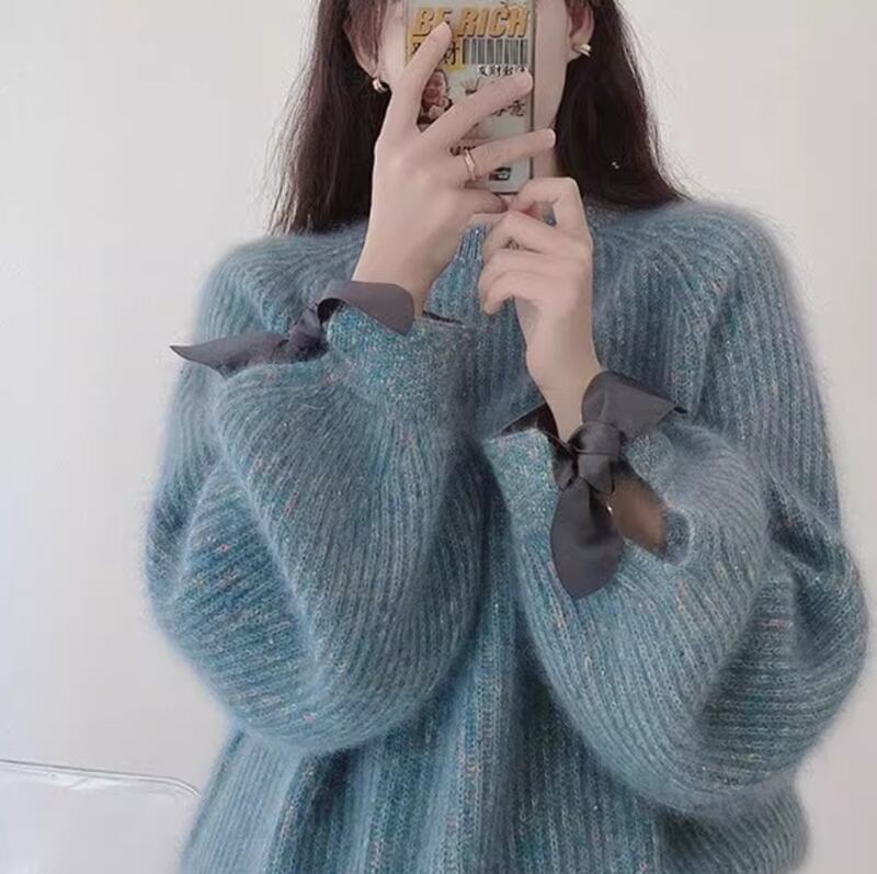 ふわふわもこもこ感が心地よい袖リボン付きの長袖セーター。