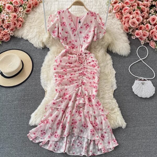 レディース ワンピース ドレス ロング 半袖 Vネック 襟なし フレア フィッシュテール フェミニン フリル 大人可愛い カジュアル おしゃれ エスニック エキゾチック こなれ感 ラフ ガーリー 主役級 存在感 ラブリー キュート 都会的 ベーシック ロマンティック ナチュラル 花柄 フラワー 総柄 夏 デート お出かけ パーティー イベント 休日 バカンス ショッピング カフェ モテ トレンド 流行 インスタ映え 定番 S M L XL 2XL サイズ展開 ピンク ベーシックカラー 大人カラー