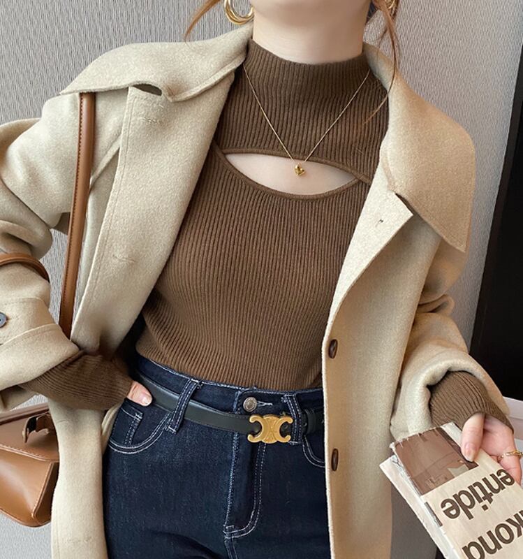 タートルネックのシルエットは、暖かさを保ちながらもクールな印象を与え、萌袖のデザインが女性らしさを演出。