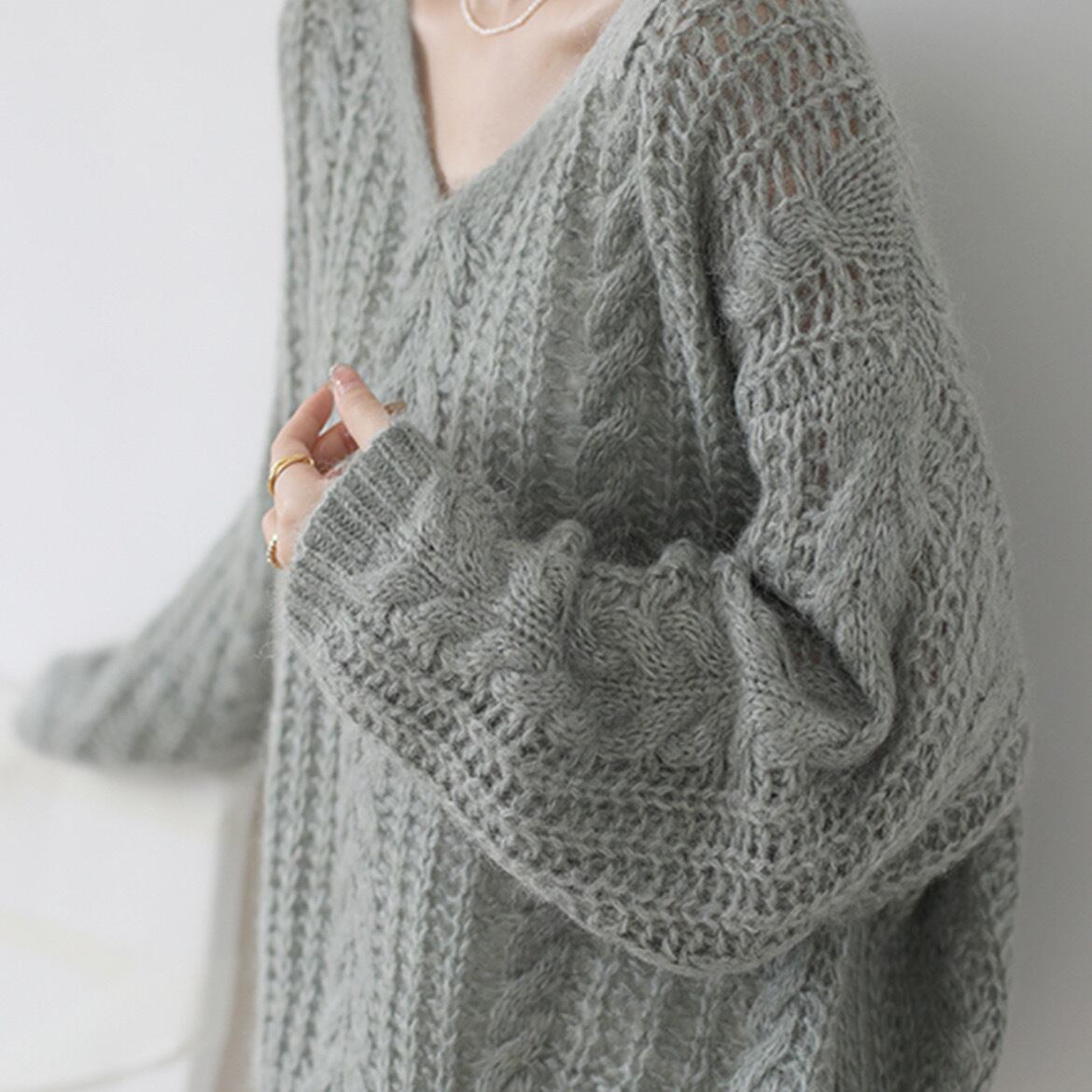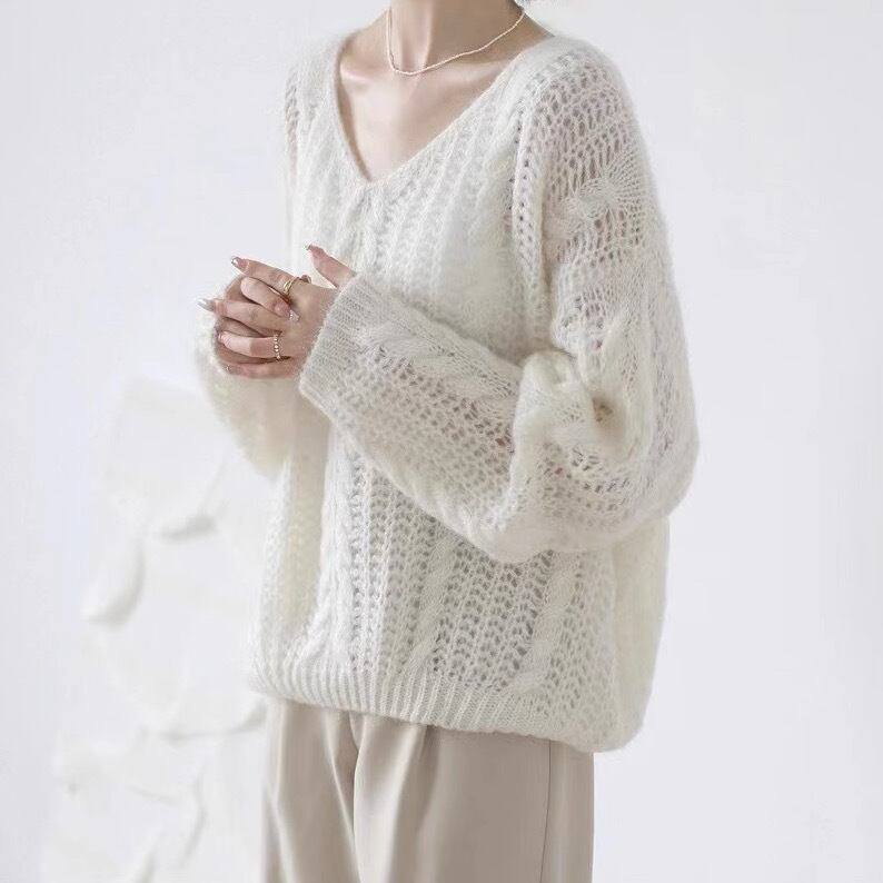 ゆったりとしたルーズなシルエットにVネック、ざっくりとした編みニットの透け感が