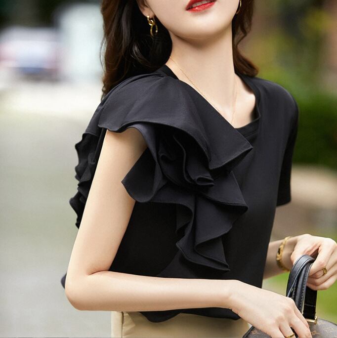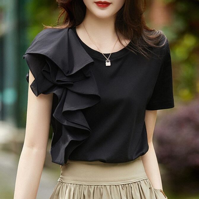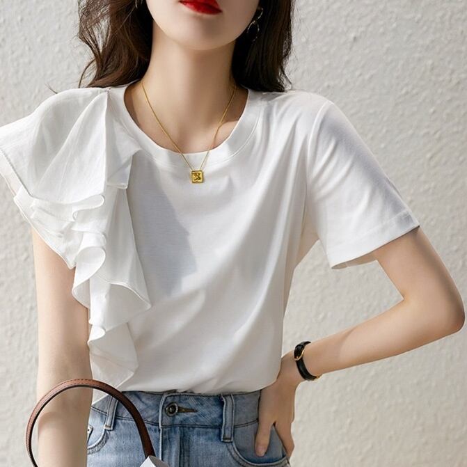 トップス カットソー Tシャツ 半袖 ラウンドネック 袖フリル ミディアム丈 プルオーバー アシンメトリー かわいい 大人可愛い きれいめ シンプル 上品 おしゃれ かっこいい カジュアル こなれ感 個性的 主役級 存在感 抜け感 春 夏 ベーシック ナチュラル ガーリー キュート 無地 女性用 レディース ママ OL 通勤 オフィス 学生 通学 デート お出かけ お泊まり 女子会 旅行 休日 アウトドア カフェ ショッピング 普段使い デイリー 着回し 重ね着 S M L XL 2XL 3XL