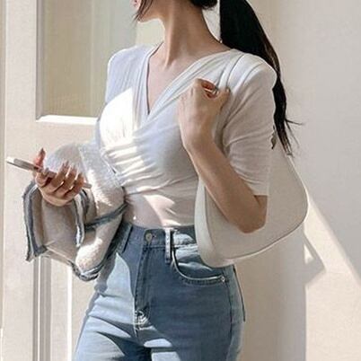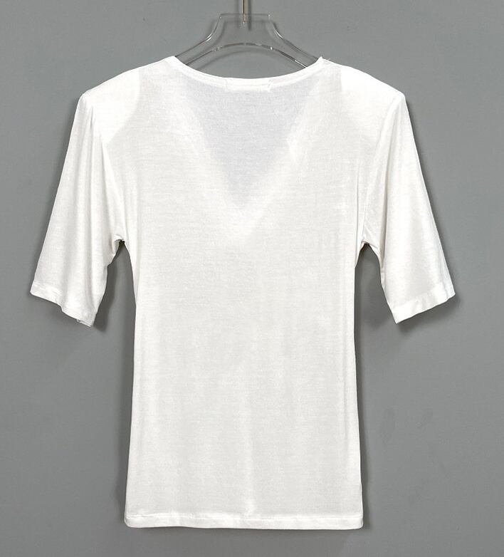 トップス カットソー 5分袖 Vネック クロスデザイン プルオーバー ミディアム丈 タイト 肩パット 透け感 かわいい 大人可愛い きれいめ シンプル 上品 おしゃれ かっこいい カジュアル こなれ感 個性的 主役級 存在感 抜け感 春 夏 ベーシック ナチュラル セクシー クール 無地 女性用 レディース ママ OL 通勤 オフィス 学生 通学 デート お出かけ お泊まり 女子会 旅行 休日 カフェ ショッピング イベント コンパ 普段使い デイリー 着回し 重ね着 ワンサイズ トレンド モテ